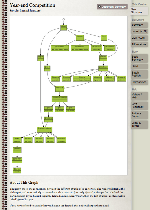 As you might guess, these structures can get complicated. There is a structure viewer that then helps you visualize what you’ve done. Here, for instance, is the auto-generated chart for the most complex storylet in Bee: