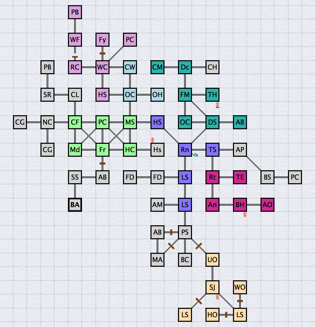 To do that, I added several set-piece scenes in which the player was briefly immobilized or focused on a special problem, or events that could remind the player that she was in danger. To place these, I studied both the puzzle chart and the actual game geography map to identify appropriate bottlenecks. (On the puzzle chart, restrictive scenes — where the player isn’t allowed to leave for a bit — appear as grey circles containing one or more boxes.)