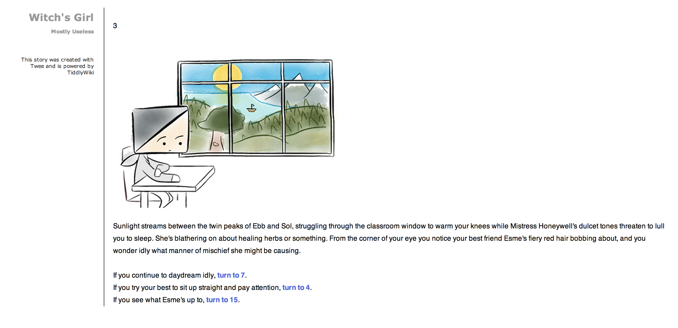 Witch’s Girl is a Twine game entered in the Spring Thing 2013 competition. It’s a light-hearted fantasy puzzle game with tropes from fairy tales and children’s fiction. Structurally a bit reminiscent of Andrew Plotkin’s puzzly multiple-choice fanfic Bigger Than You Think, Witch’s Girl rewards playing back through previously visited branches of a CYOA tree with new knowledge; it leverages Twine’s variable-tracking abilities to open up new avenues from certain pages. Illustrated with childlike drawings, it looks and feels different both from parser IF and from many of the blue-and-black Twine games recently released.
