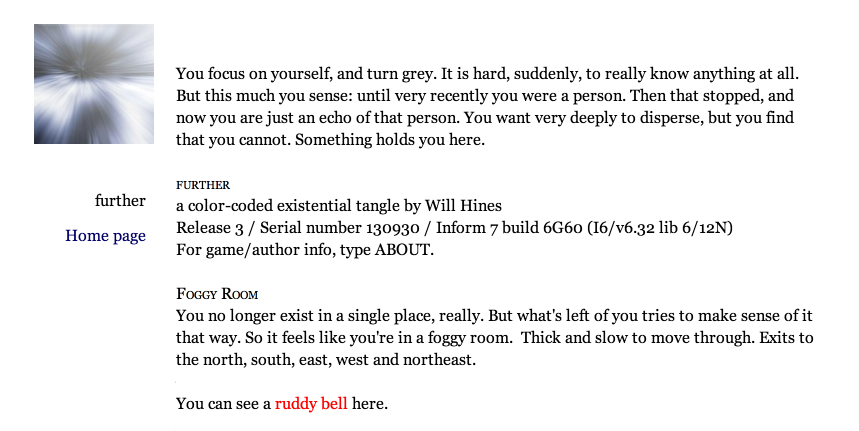 Further is a parser-based, lightly puzzly surreal story about a ghost negotiating its passage to the afterlife. Play time, roughly 10 minutes. Review after the jump, light spoilers in the sense that I describe what the gameplay is like.