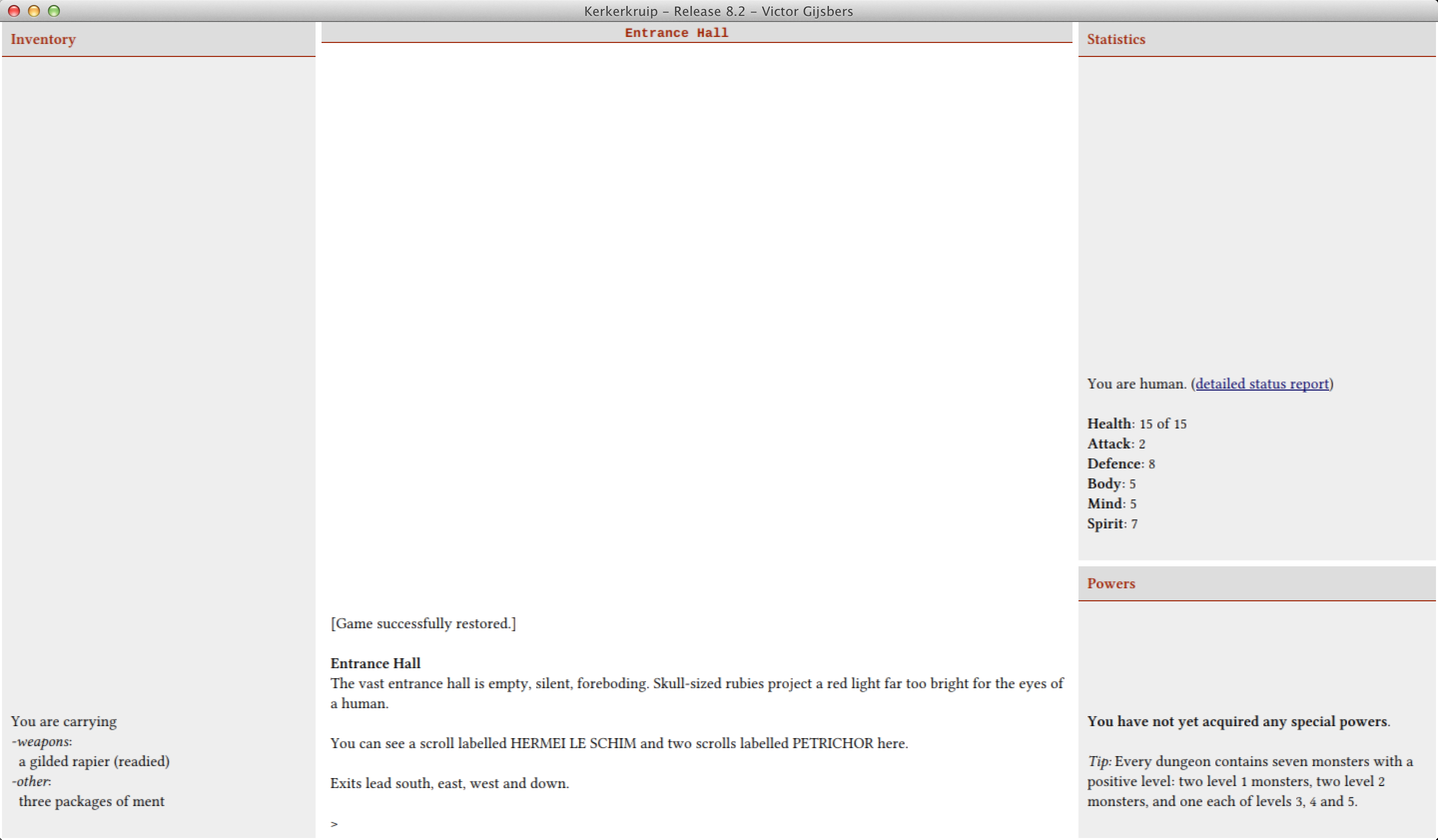 I last played Kerkerkruip when it was an entrant in IF Comp 2011. At the time, I was sort of luke-warm on it: it’s a roguelike game done as IF, which is very different from most of the competition it was up against, and I found it distracting to have success and failure messages (with die roll information) mingled in with more descriptive handling of character behavior.