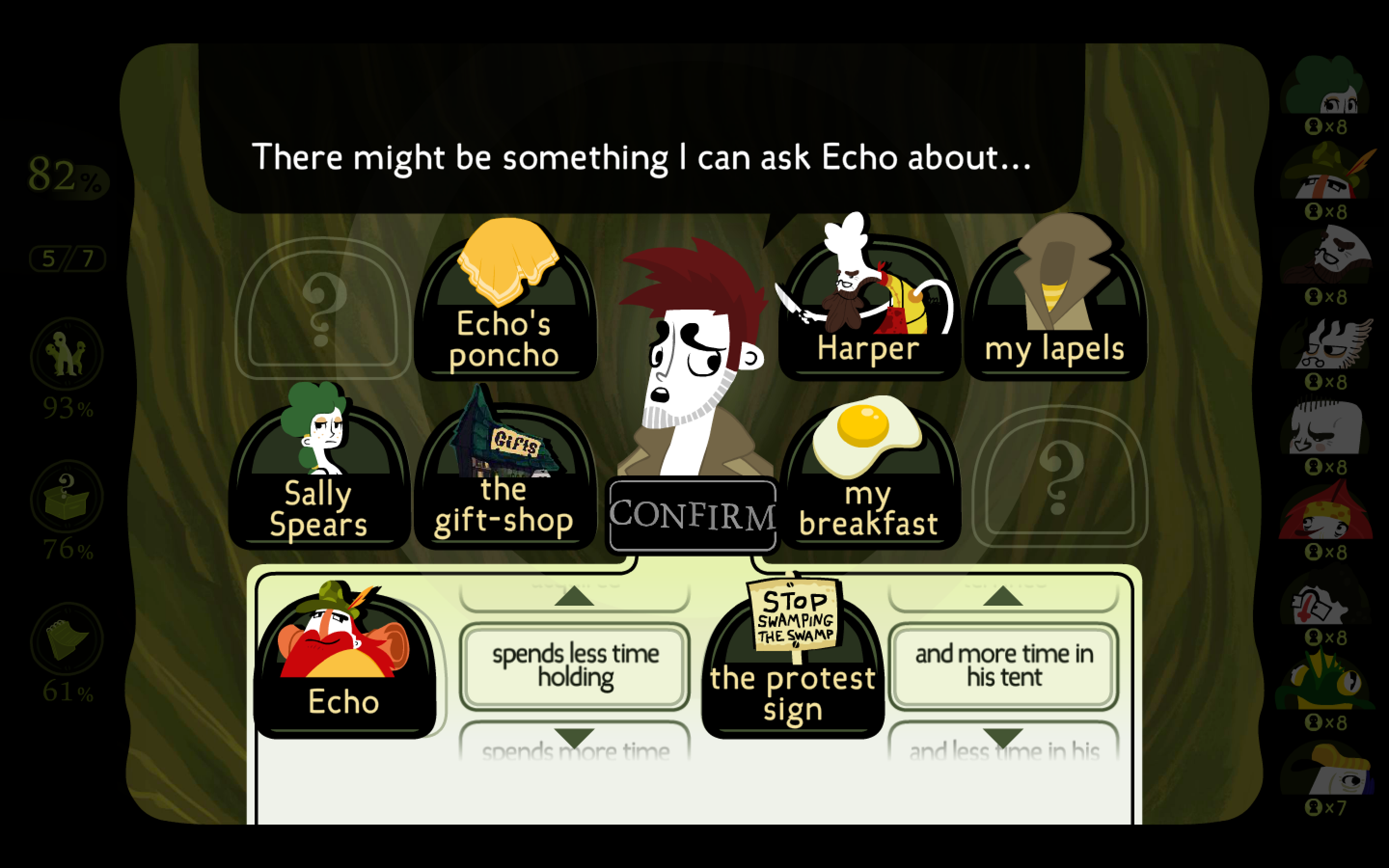 Detective Grimoire is a short (90-180 minutes, probably, depending how much you rush through the voiceover parts) point-and-click mystery adventure. It’s pretty easy — strong hints about what to do next and what you might have missed thus far, as well as a “sparkle” mode to draw attention to environmental object that you should really look at. (If you want a more classic pixel-hunting experience, you can turn the sparkles off.) The content is also reasonably kid-friendly; though you’re investigating a murder, the actual and hypothesized reasons for that murder are all kept fairly PG. Some other reviewers refer to these as “grisly” or “dark”, but I didn’t find them so; it seemed to me that the character motivations are either quite gentle or cartoonish or both. If you squint, there’s maybe a bit of an argument for preserving the wilderness, but even that is softly handled enough that it avoids any political bite.