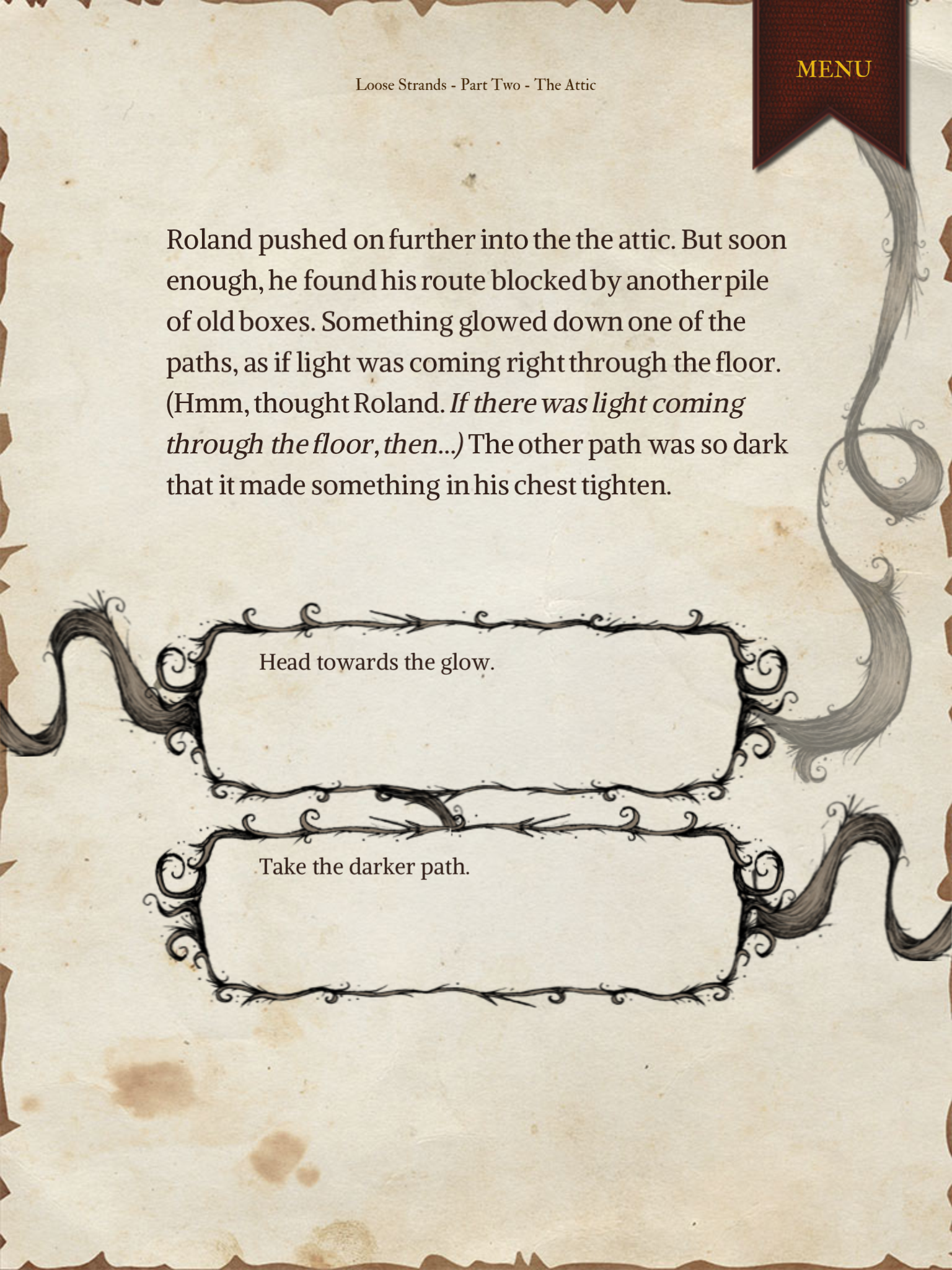 Loose Strands belongs to the children’s book-app market, and as such it is working from a different set of traditions than game-based CYOA. Their blog post on the uses of interactivity, for instance, defends against the complaint that interactivity is distracting. I’ve spent a lot of time arguing against people who think that interactivity destroys a story because it gives the player too much freedom, but “interactivity is distracting” is a new one on me. It presumes the primacy not only of the story, but of the reading experience, the intake of words.