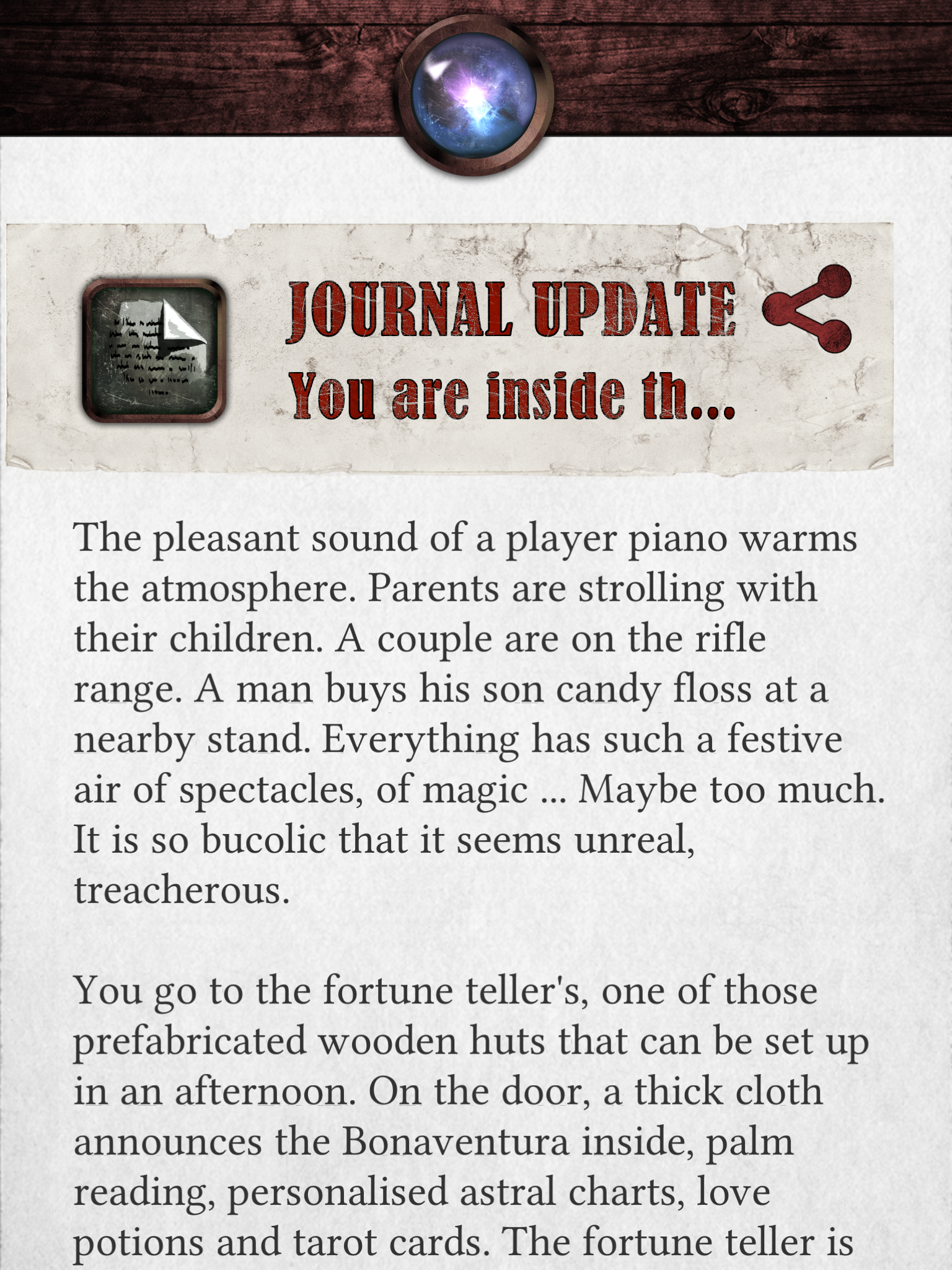 Likewise, UI elements sometimes feel out of proportion, with text or icons the wrong size for one another: for instance, this “journal update” allows you to see only a fragment of what is being updated, while consuming a substantial amount of the readable area. The text in The Sinister Fairground also seemed a bit big on my iPad — perhaps the font sizes were chosen to account for the proportions of a phone, instead? And there can be a disconcertingly long pause after making a selection in Necklace of Skulls, which sometimes had me wondering whether my tap had really registered at all.