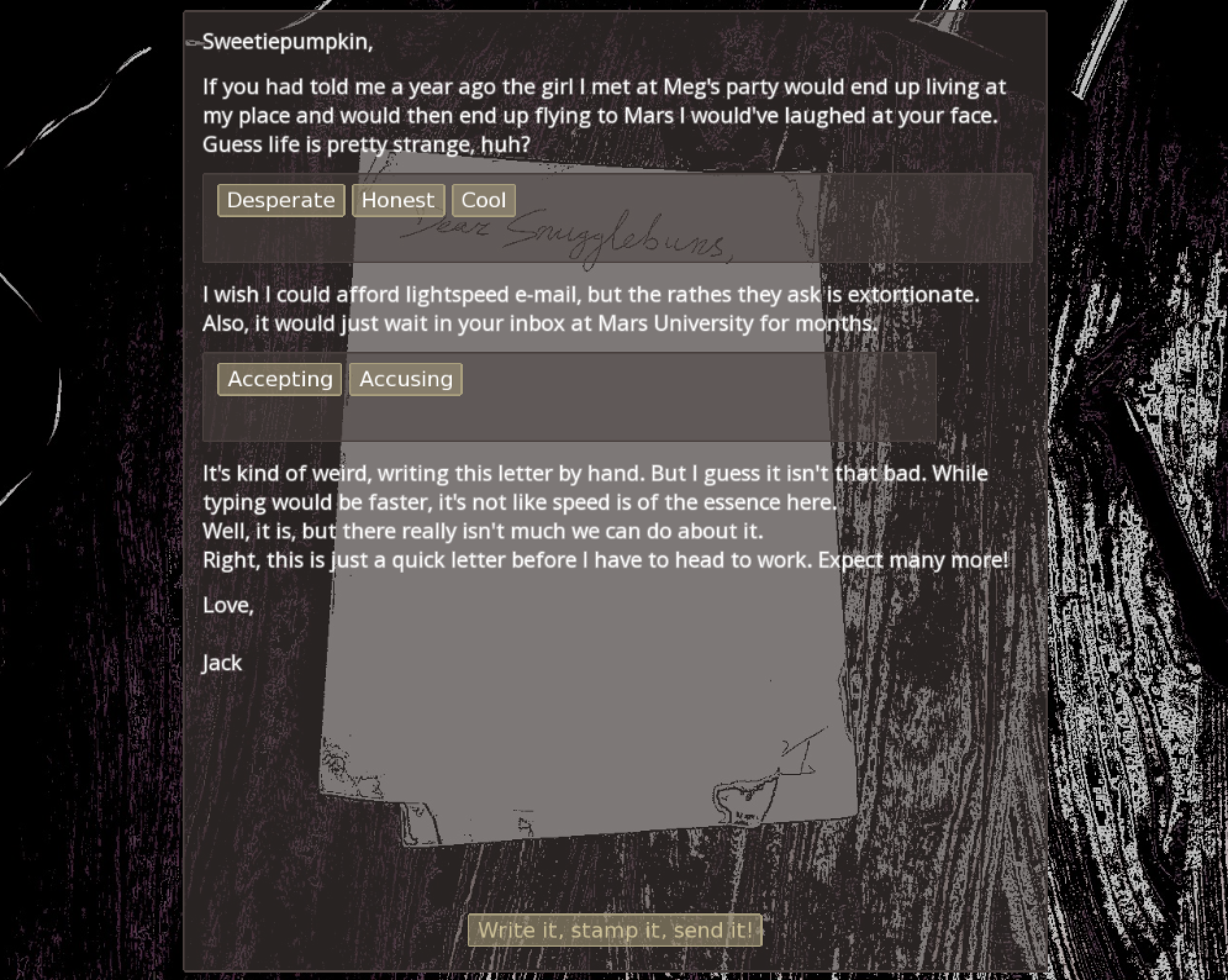 13 Minutes of Light is also an interactive epistolary story, this time in Ren’Py: you are a man in a long-distance relationship with a woman who has gone to work on Mars, and can communicate only by physical letter. I found it implausible that physical letters, with their attendant mass, would actually be cheaper to send to Mars than other forms of signaling — but that’s the premise, and it allows the interaction to spool out over long periods of time. Over the course of the game, you select which of several passages to include in your letters, and these provoke different reactions from the girlfriend — whereas First Draft is more about exploring character mentality, 13 Minutes of Light is changing stats based on what you say. I wish it were a bit longer: it feels like the points of conflict between the protagonist and his girlfriend are only really starting to develop when the game ends, and I would have enjoyed exploring at more length. But as this was created for a game jam, its brevity is arguably not that surprising.