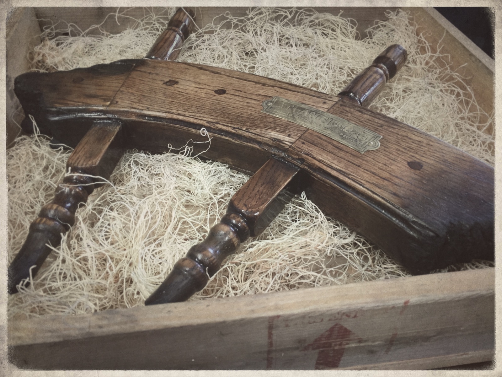 A piece of an exploded wooden ship’s wheel. Not only did we have to manufacture an angled piece of the wheel, but it needed to be varnished, then burned significantly at either side, then aged to over 150 years old. It included an engraved brass plate with the name of the ship and the company that built it, which was a challenge to do in and of itself.