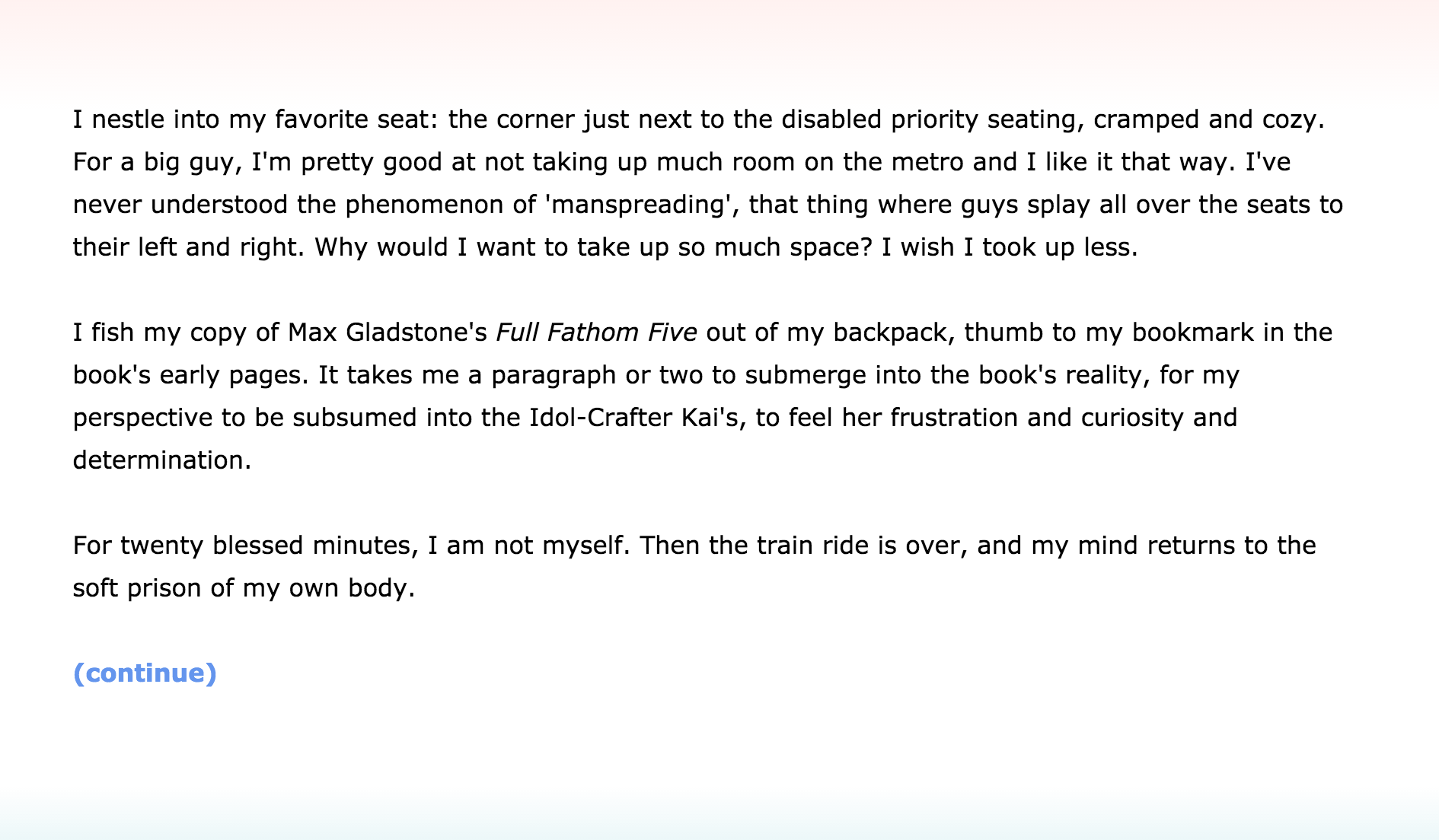 It’s a longer, less visceral piece than Caelyn’s previous Cis Gaze, playing out as a more substantial series of scenes — though there are still some passages with a gut-punch effect, as when the protagonist encounters some particularly unpleasant humor that hits her vulnerabilities.
