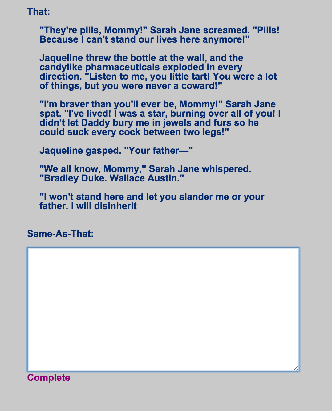 I obediently did copy, being as faithful as possible. I’m not sure it matters at all what you type here. The game was not obviously checking and didn’t give me a pat on the head for getting it “right.”