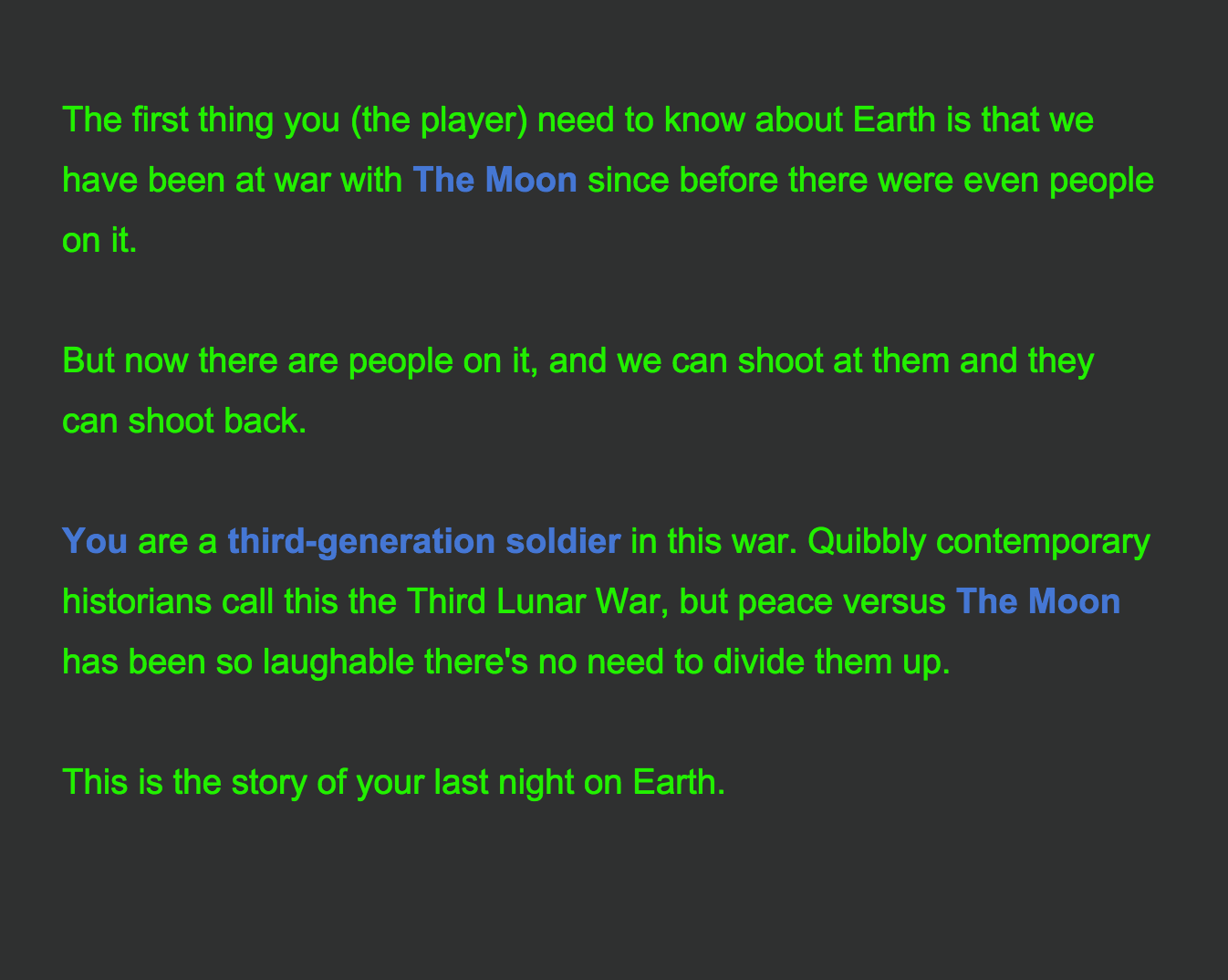 tonightdiesTom McHenry is familiar to people who follow Twine as the author of the grotesquely fascinating Horse Master. Tonight Dies the Moon is his Twine contribution to Antholojam, and is a diptych of stories about an ongoing Earth-vs-Moon conflict. It is less narcotically surreal than Horse Master, but it shows many of the same influences and artistic impulses. There is pixelated art, there is resource management more for the sake of the experience of managing resources than because the player can ever hope to gain anything thereby, there are small evocative hints of a large horrible dystopia.