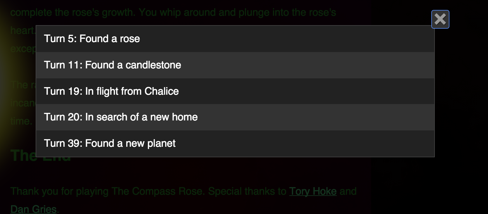A technical coolness: The Compass Rose lets you rewind (check out the About link), and (unlike most Twine pieces I’ve tried) allows you to select a choice point to go back to: