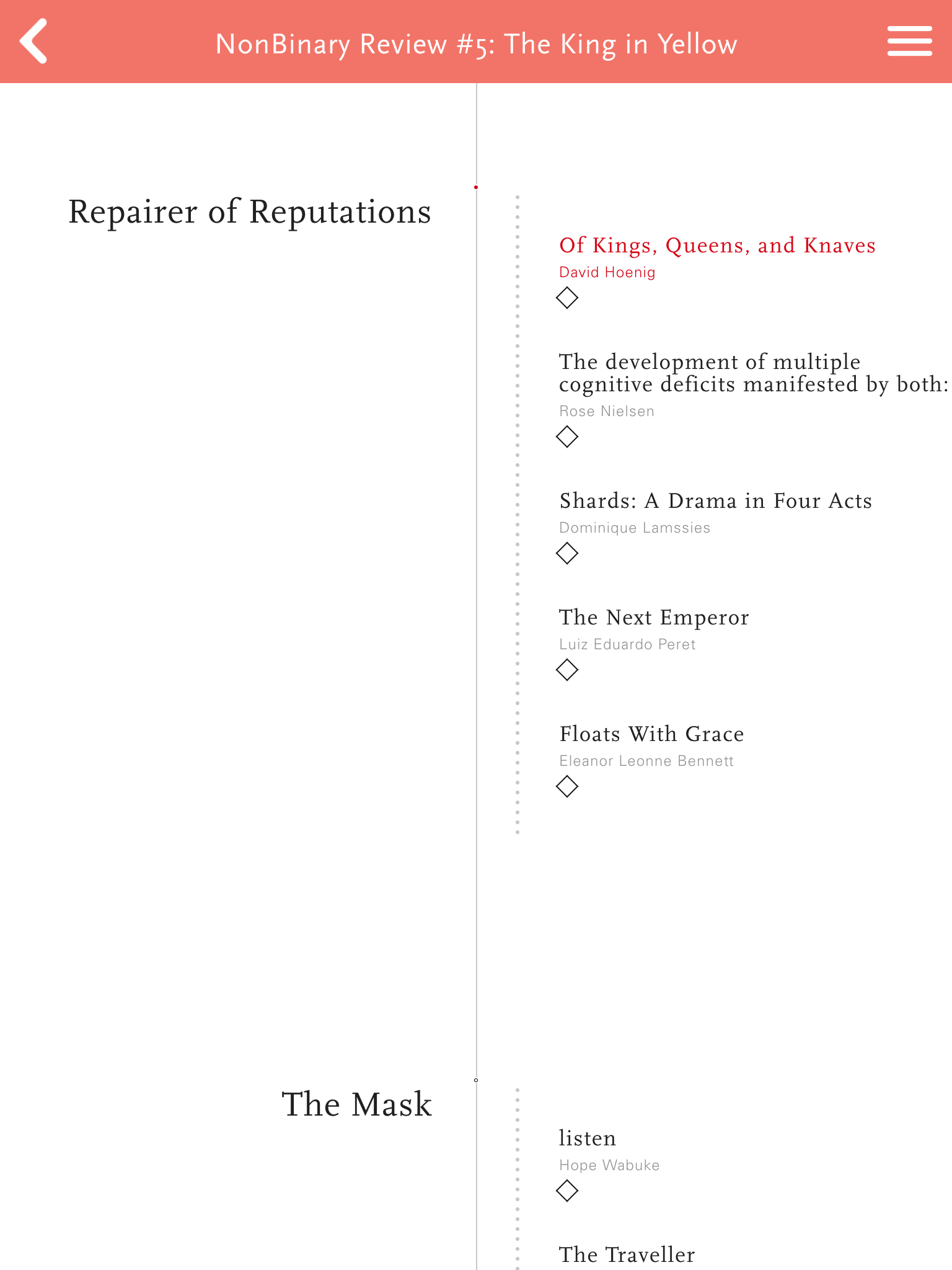 IMG_0150The Lithomobilus advertising copy confuses form and content, suggesting that it is something about the app technology that will make it possible to read “more” about your favorite world. The formal features of the app are not groundbreaking: each work is presented as a table of contents from which the reader can choose to read a portion, much like reading an ordinary chapter from a book. In the NonBinary Review, there’s a distinction between primary works and spin-off works, with the primary chapters on the left and spin-offs on the right. I found the navigation fiddly, in fact, and often had to tap several times just in order to open a section. The app doesn’t provide any method of bookmarking which sections you’ve already read, in contrast with some other systems that encourage non-linear reading. (The standalone app for Iain Pears’ Arcadia does this, for instance.) Lithomobilus also offers even less information than a physical book would about the sections themselves: without page numbers or physical embodiment, you don’t know going in whether clicking a title is going to take you to an artwork, a single page of poetry, or a long story.