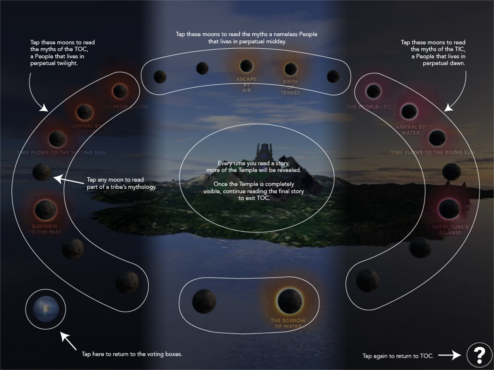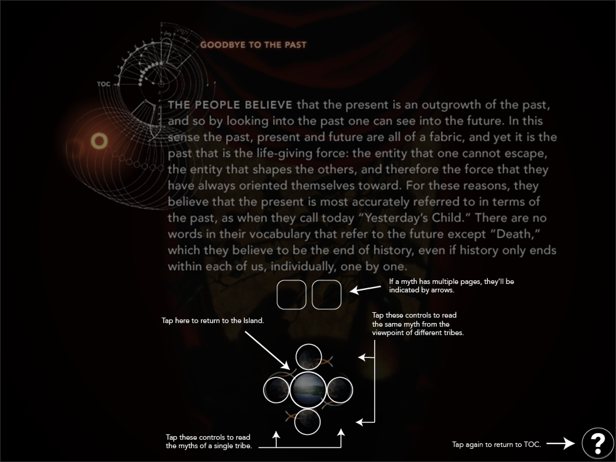 From there, the story goes on to deal with an island inhabited by the Tic and Toc peoples, who have mirror-image versions of the same ideas about time and its passage. The interface here allows you to move from one myth to another myth told by the same people, or the same myth as it is told by the opposite people.
