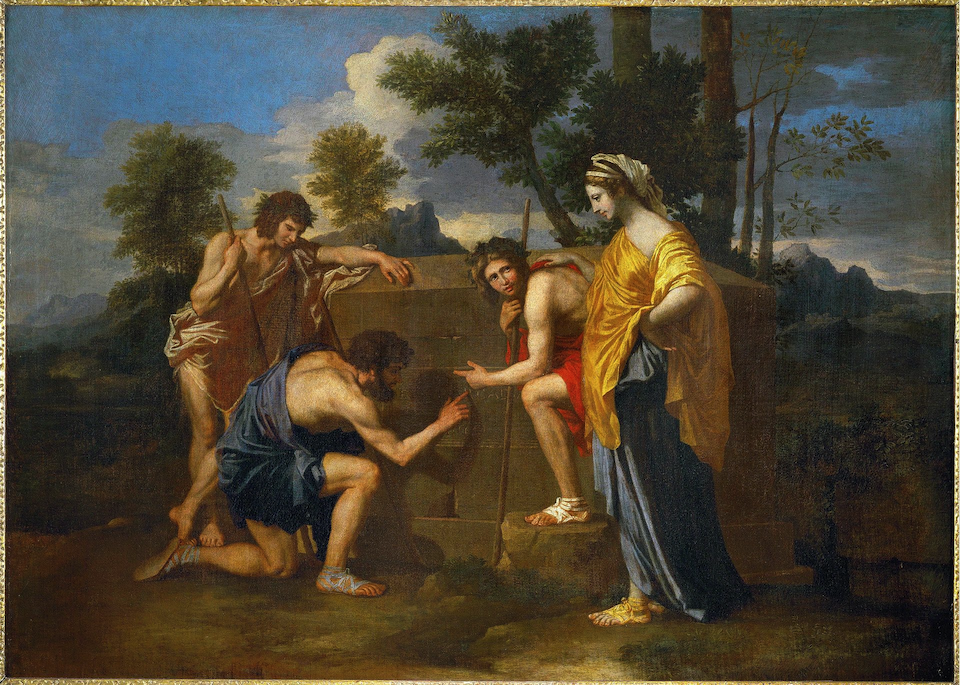 Then there is Poussin’s painting Et in Arcadia ego, in which shepherds gather above a tombstone with this inscription. The Latin inscription is probably most grammatically translated “even in Arcadia, I exist,” and the “ego” in question is Death, by analogy with earlier works on the same theme. But Erwin Panofsky’s essay on Poussin defends reading the text differently on the basis of the image, something more like “I [the buried person] also lived in Arcadia,” and as part of an ongoing shift in how the line is interpreted in art and literature. The painting is thus ambiguously a memento mori or a recollection of a happy life seen in retrospect.