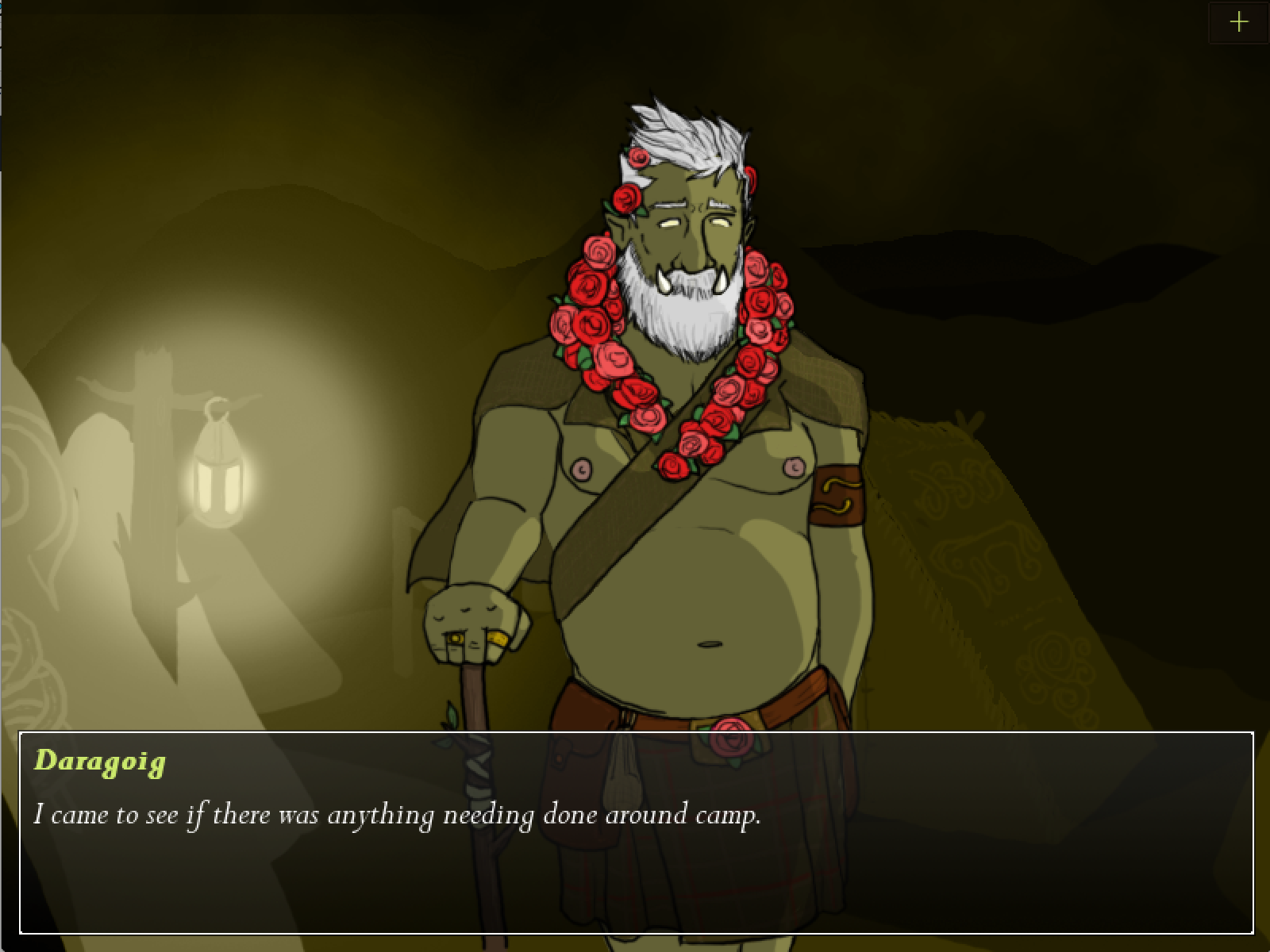 There’s a lot of dialogue even in the short demo, quite a bit of which concerns the change in orcish communities over time. It’s a not-at-all hidden way of talking about queer communities, and in particular the fact that being treated badly by the rest of society tends to produce intense bonds on the inside. One of the orcs reflects how decreasing marginalization can lead to a loss of solidarity and identity. The discussion around this was pretty nuanced and well-observed. By the end of the first day, I felt more invested in the group I was part of than attracted to/invested in any one romantic prospect.