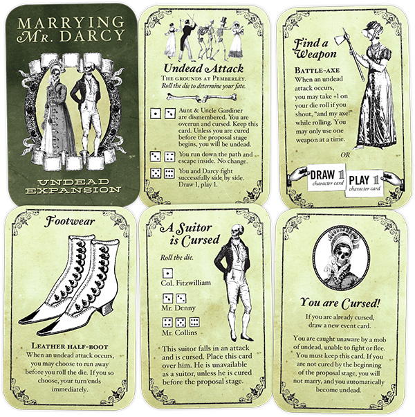 I regret to say, finally, that Marrying Mr Darcy offers an undead expansion in case you want to make your card game into a rendition of Pride and Prejudice and Zombies. I know I’m cranky and complain about zombies pretty much every time they appear, but I am especially tired of PPZ derivatives. You know how Onion articles are funny headline plus three cups tepid water? Brewing a whole subgenre by that process leaves you with homeopathic levels of humor.