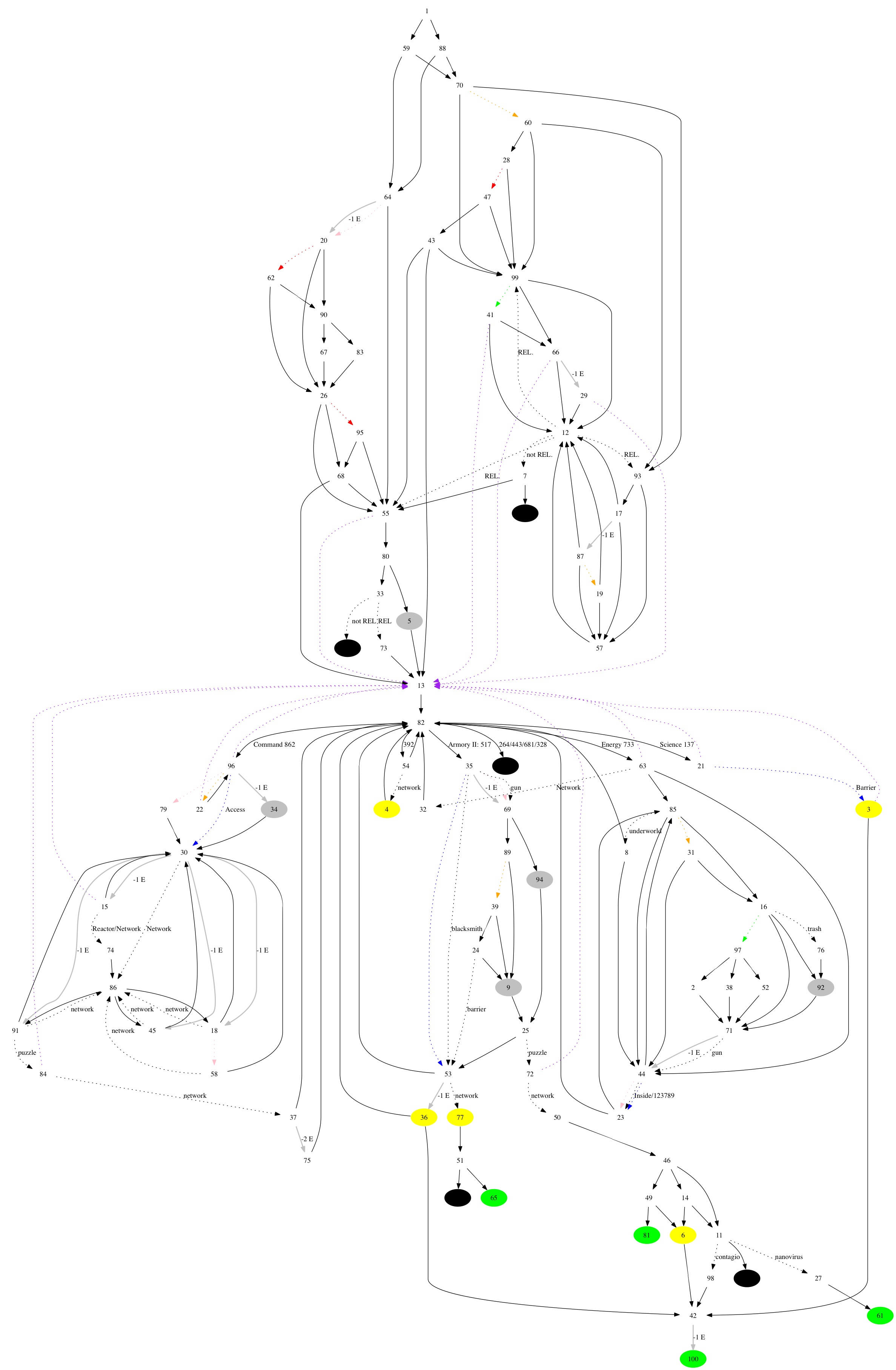 Below is the vast and glorious map. Green dots are endings in which you survive; black dots, endings in which you die; grey dots, points at which you might die, but might live to go on to another node. Yellow marks points where you gain status markers that affect your final score in the game. Dotted lines represent conditional transitions, where you can move from one node to the other only if certain prerequisites obtain — you have the right resources, or you’ve recorded the appropriate keywords for your character.