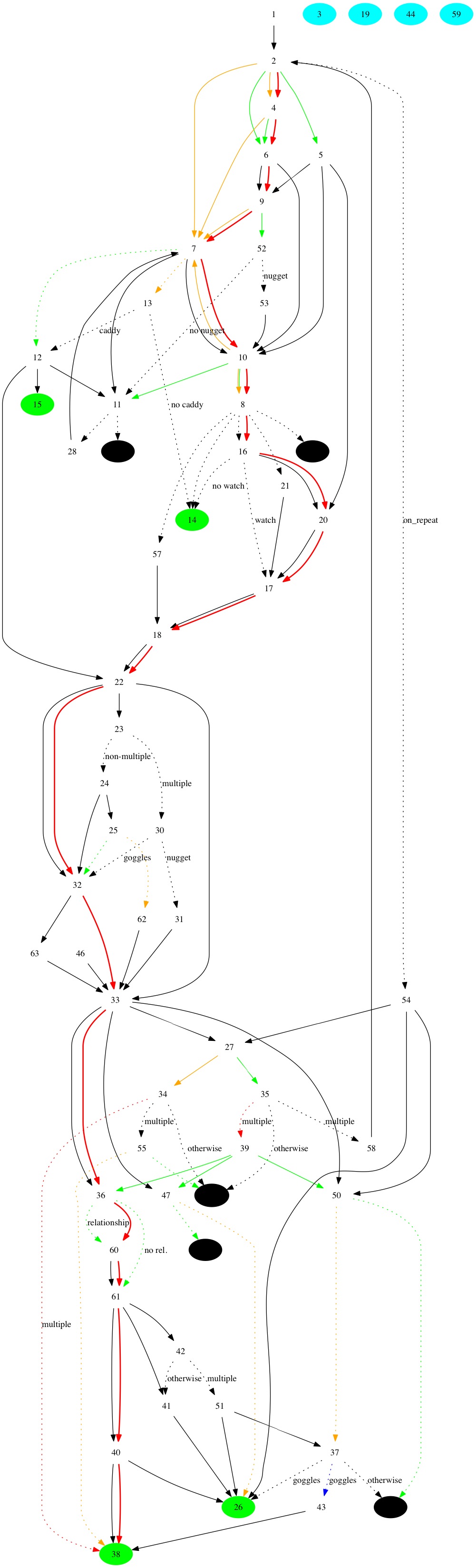 Second, those stats partly describe personal character rather than ability (in common with a lot of CoG work) and are developed during play rather than selected at the beginning of the gamebook. The two major personality stats in play are Trust and Caution. If you do something trusting, your Trust rises (up to a maximum of five); if you do something cautious, your Caution does the same. (I don’t think you can lose either kind of stat.) On the diagram, solid orange lines raise caution and solid green lines raise trust; dotted orange lines are available if your caution is higher, and dotted green lines if your trust is higher.