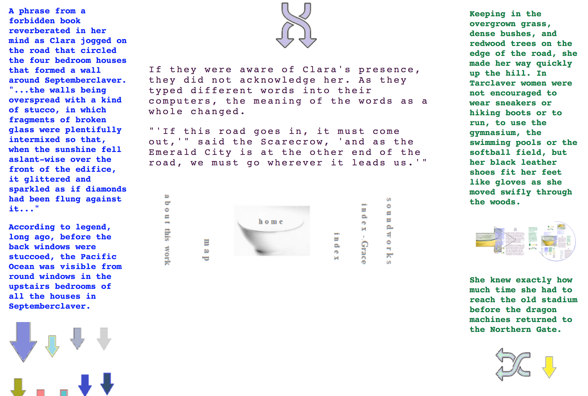 The piece features three narratives: a main storyline about the protagonist Grace, filling the center of the screen, and then two adjacent narratives, which are speculative fiction/fantasy stories that she is making up about two different women who are trying to escape oppressive environments. All three narratives contain a fair amount of domestic detail, of the preparation of meals and the mundane texture of daily life. In the end, the side narratives will end with the two fictional characters meeting.