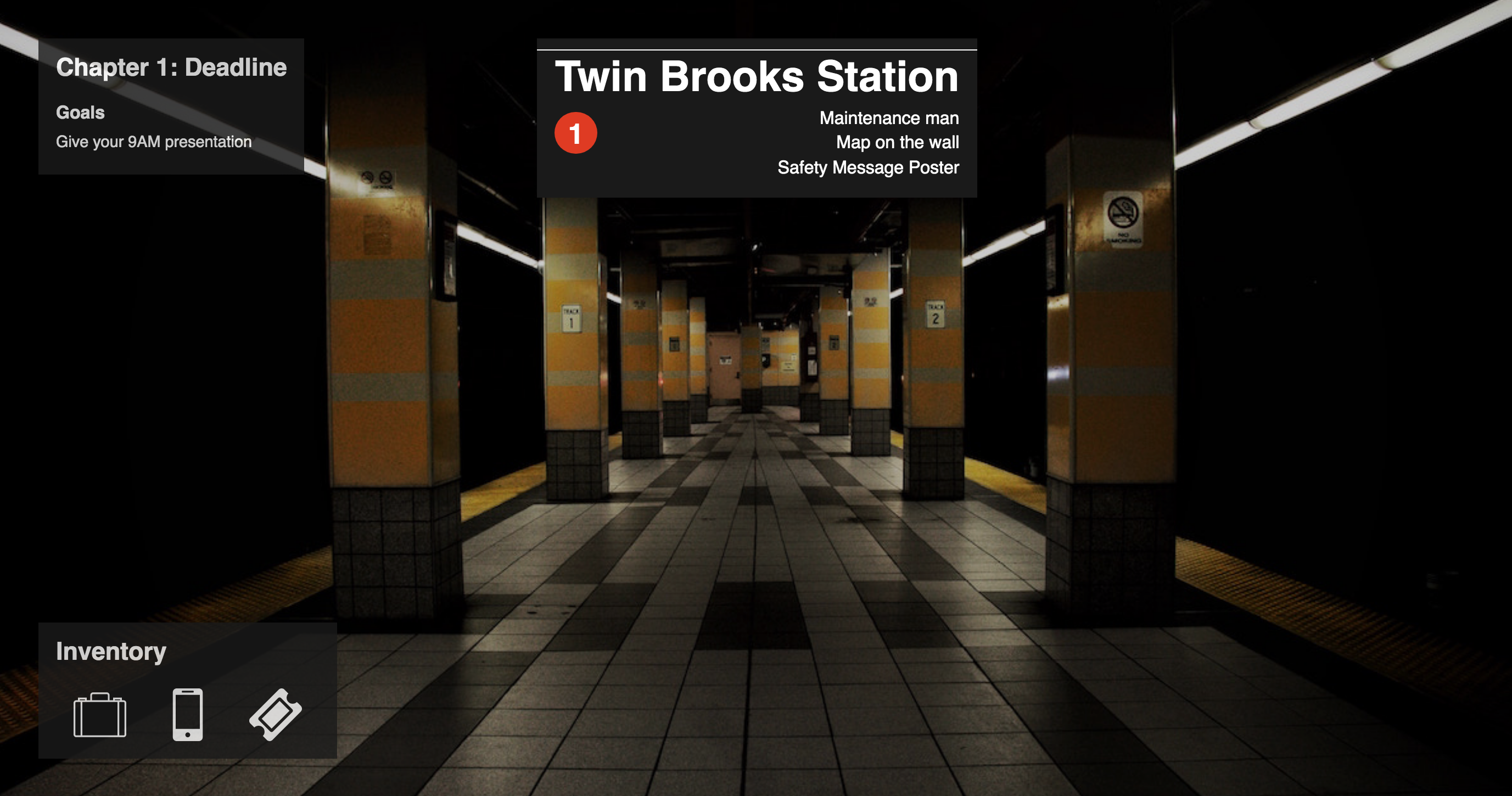Deadline is choice-based, but uses a world model with distinct locations, and provides inventory items and goals for interaction, which gives it a bit of an adventure-game feel.