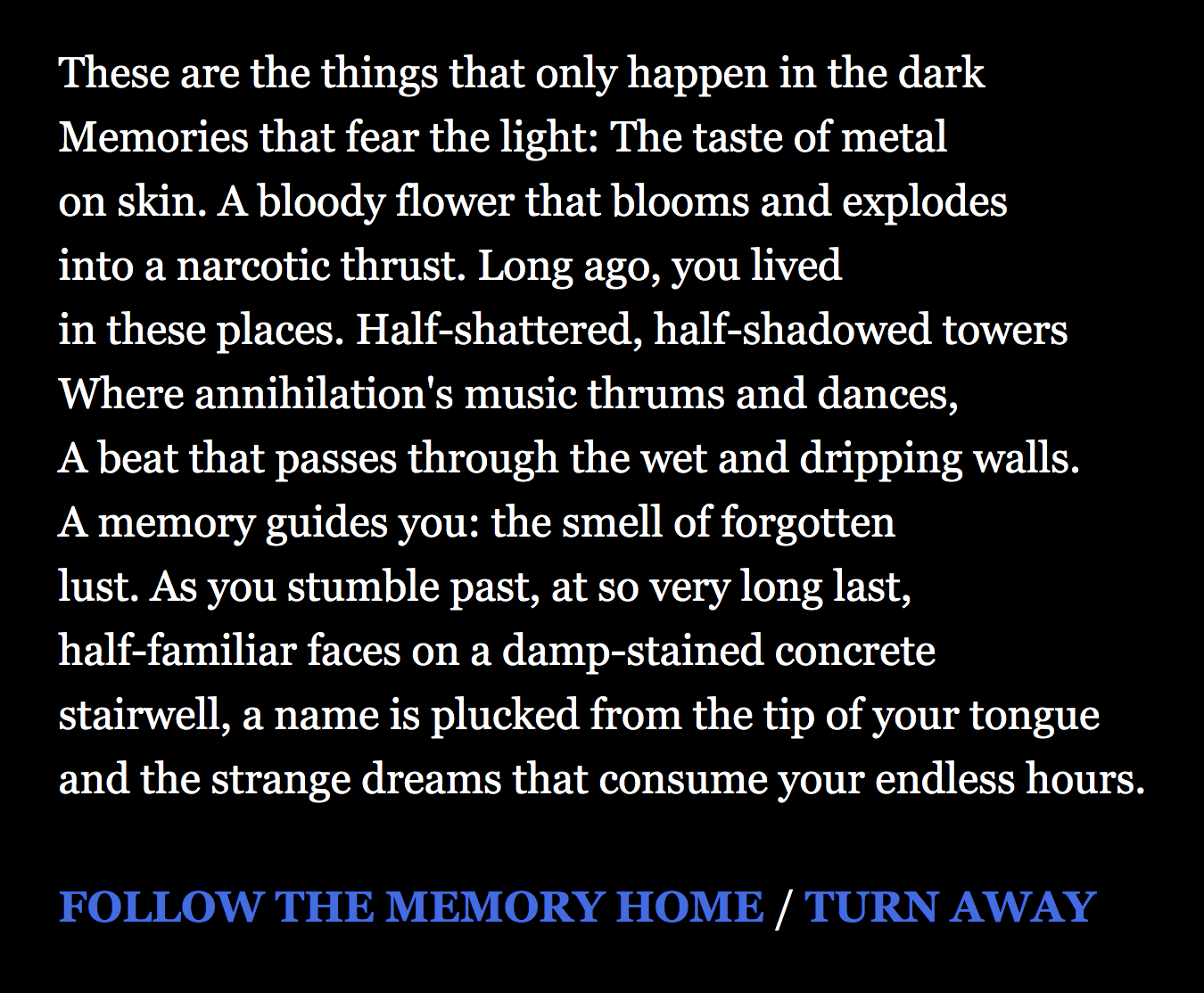 Sunder is an interactive poem, read aloud as audio files that accompany the piece. The audio plays automatically and energetically. The scenario seemed to me to be about someone who lives, or had lived, in a tower block, perhaps using or perhaps refusing heroin; or (simultaneously or alternatively) is a monster of sorts; or (again) is a kind of Odysseus trying to return to Ithaca.