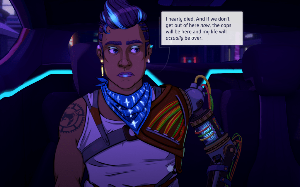 A few of the reviews complain that the arc story of the game is less compelling than its subsidiary vignettes. I think I agree with the observation, but didn’t really mind. One of the implications of Neo Cab‘s structure and content is that low level, daily human connection is the real substance of life, and the context in which most kindness occurs. Not everything is, or needs to be, a grand heroic act. And some of Lina’s own motivations and feelings are allowed to emerge subtly, over the course of multiple conversations with different passengers.