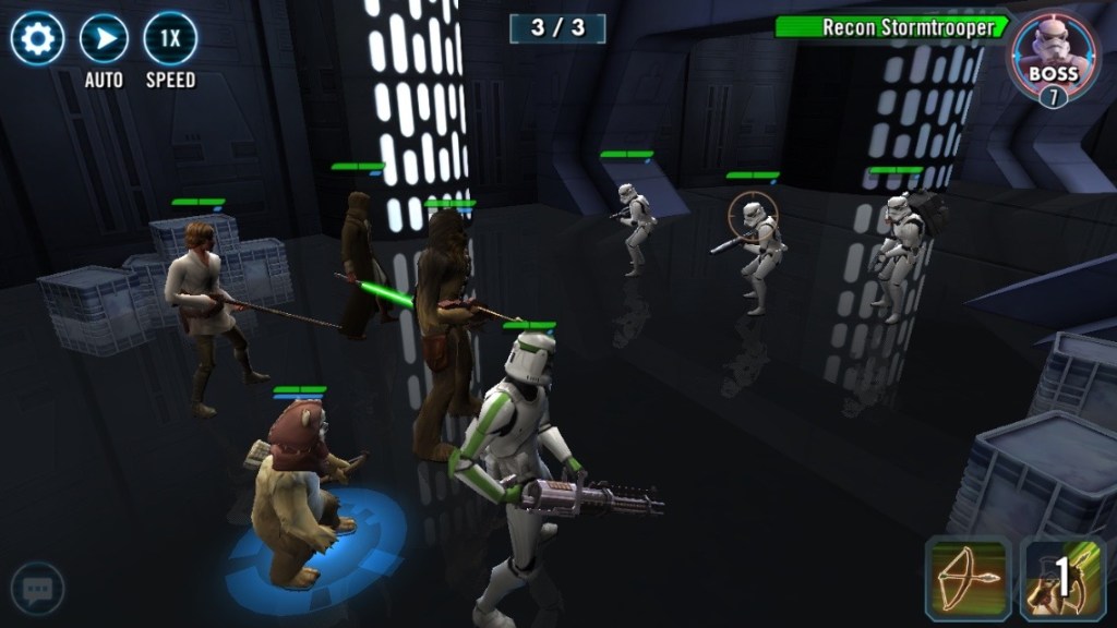 Tactics and grasp. Tactical RPG games and similar work offer the player lots of ways of solving a level. Galaxy of Heroes lets you build combat parties, mixing and matching characters from different eras of Star Wars, different factions, different alien races; it lets you play different combat tactics, as well. In the current implementation, that’s treated almost entirely as a series of mechanical choices rather than fictionally-significant ones. But one could easily tie some story in.