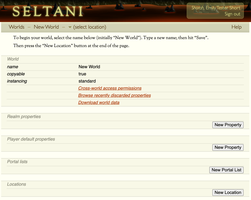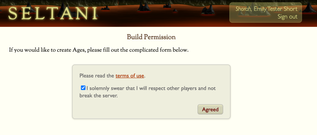 If you want to build for Seltani, go to seltani.net and make a new account. Initially, you won’t have build permission; to fix that, click on your account name in the upper right corner.