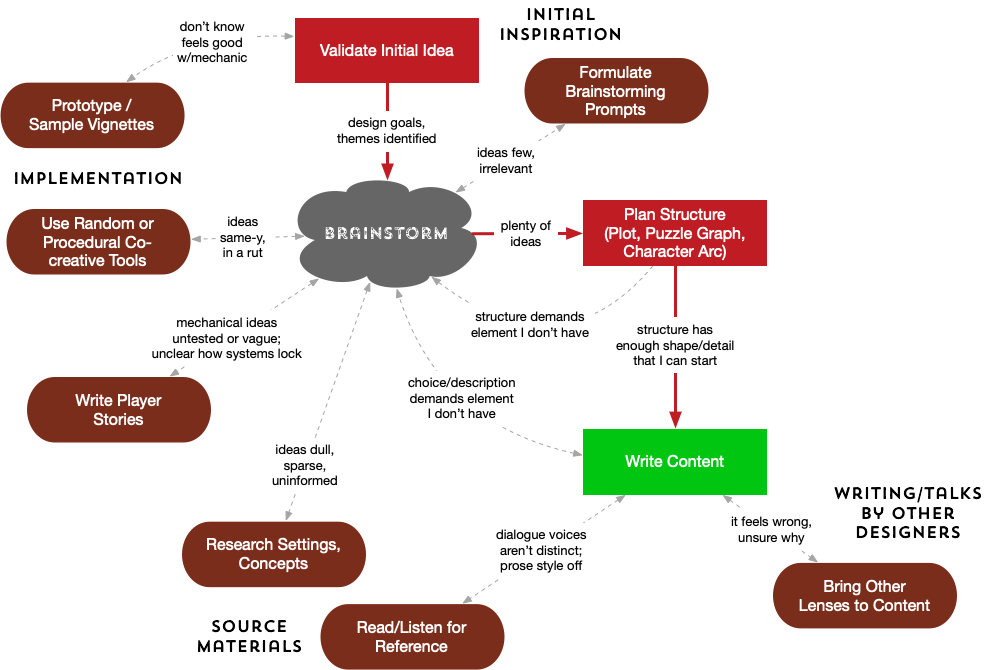 I was also thinking on a more micro level: tips for coming up with specific story beats, characters, choices, puzzles, items, descriptions. Maybe the answer is just “brainstorm a lot”, or else “collaborate with someone who’s good at brainstorming”.