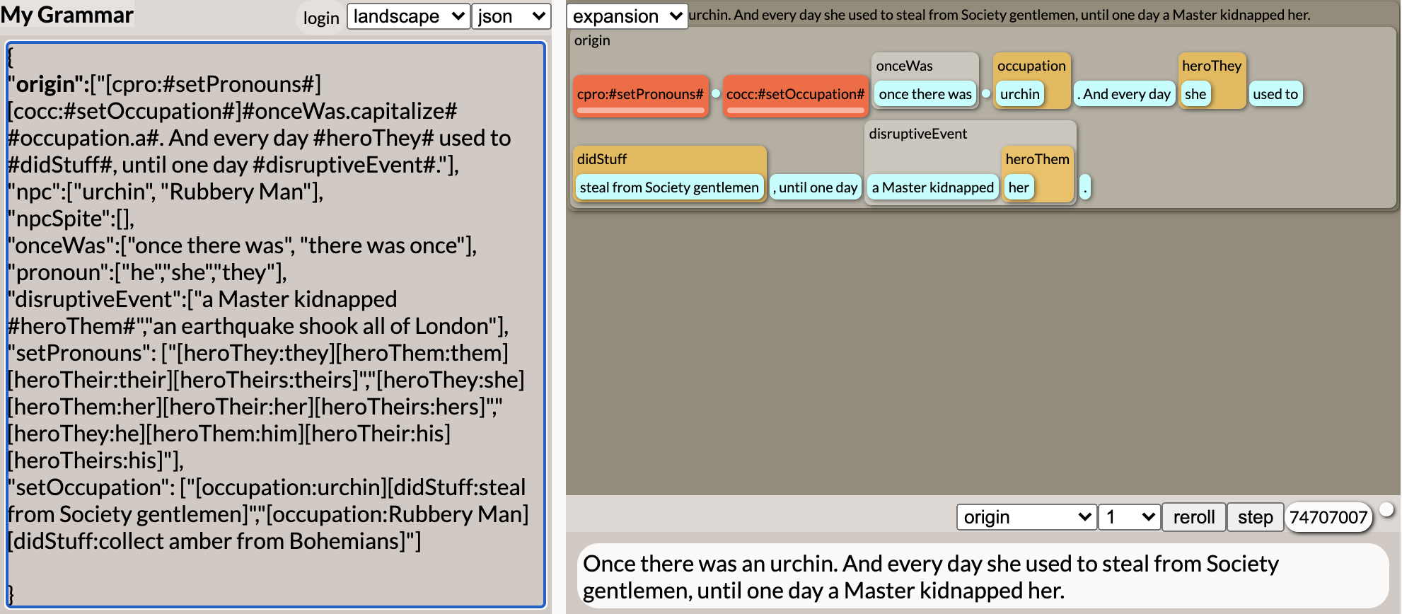 Screenshot of the procedural grammar tool Tracery being used to fill in a "once upon aa time" story prompt.