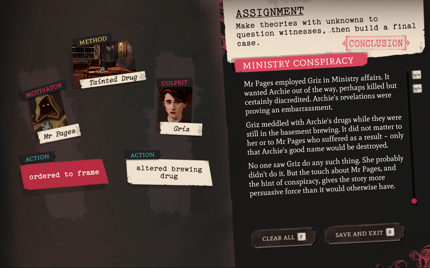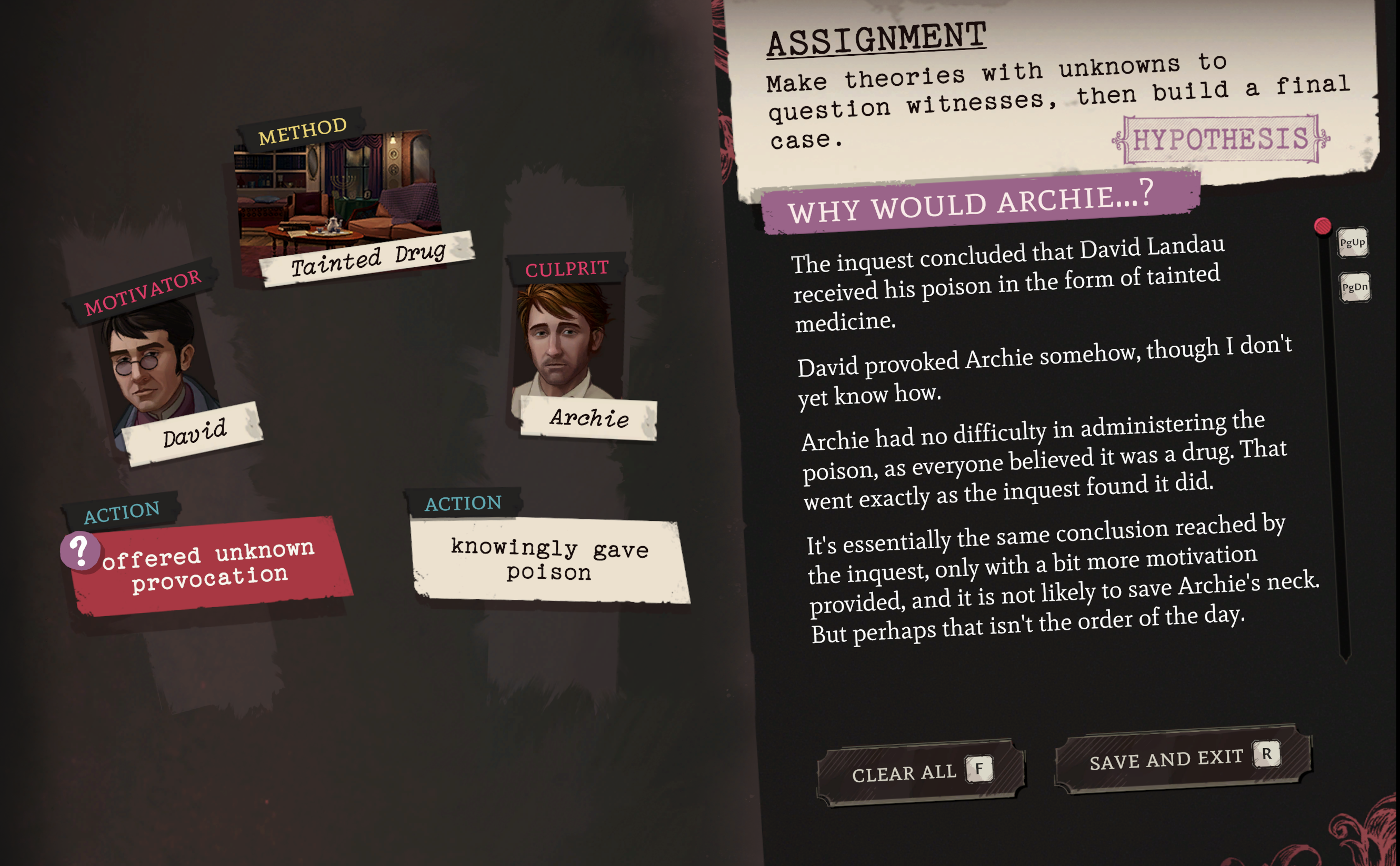 Ultimately, the player can build a substantial range of finished theories, including the truth or partial versions thereof, but also a number of alternative explanations.