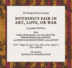 “The Play” is an Undum piece by Deirdra Kiai (Life Flashes By, Pigeons in the Park). “The Play” concerns the dress rehearsal of a play about a statue come to life, her artist, and an escaping gladiator. There’s a certain amount of slapstick humor, but mostly the story is about juggling the moods of the actors you’re overseeing in an attempt to get through the evening.