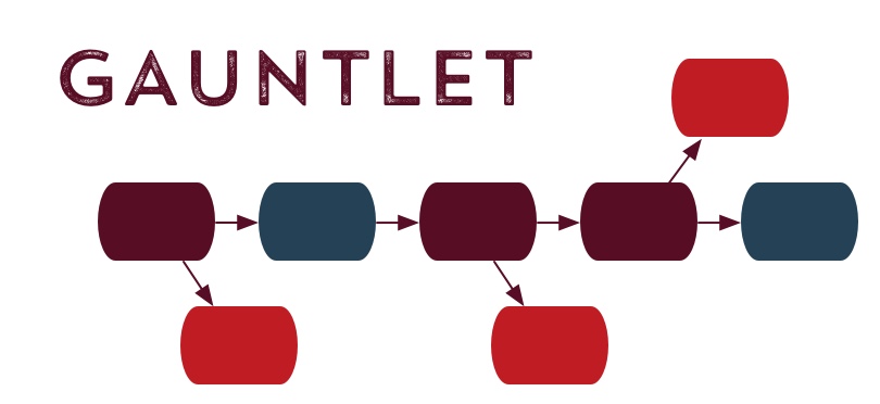 For instance, here’s a gauntlet storyline, linear except where the player makes a mistake, as it might be represented in Twine and then as it might be represented in storylets: