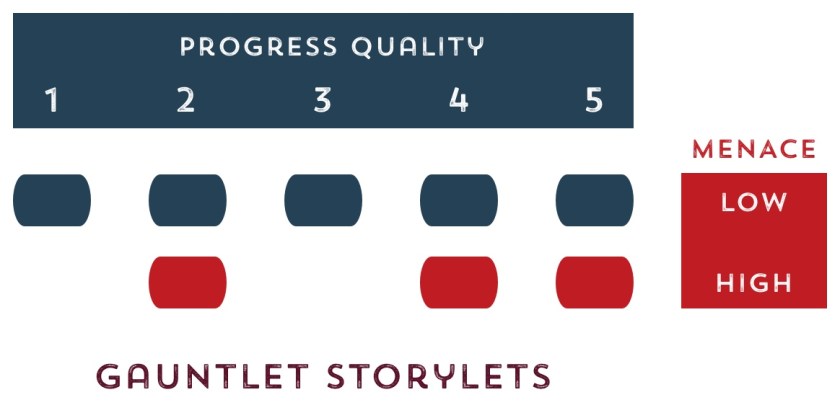 But for the present article, I’m looking chiefly at how many standard ways of structuring game narrative content can be rendered in storylets.