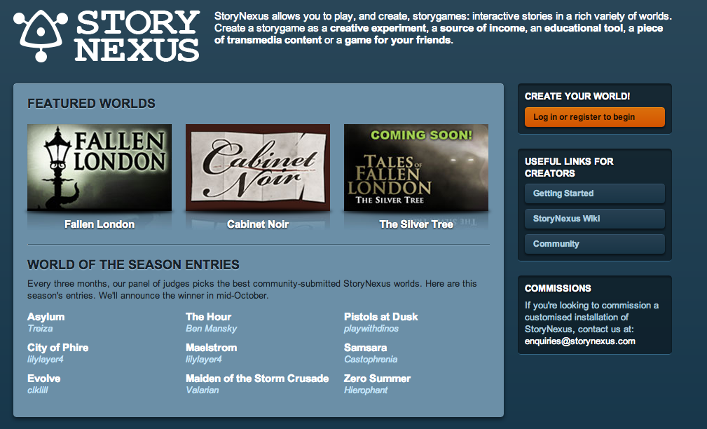 Trailed for some time as a new creative tool from the team at Failbetter responsible for Fallen London (aka Echo Bazaar), Cabinet Noir and the Night Circus, StoryNexus is now open for public use.