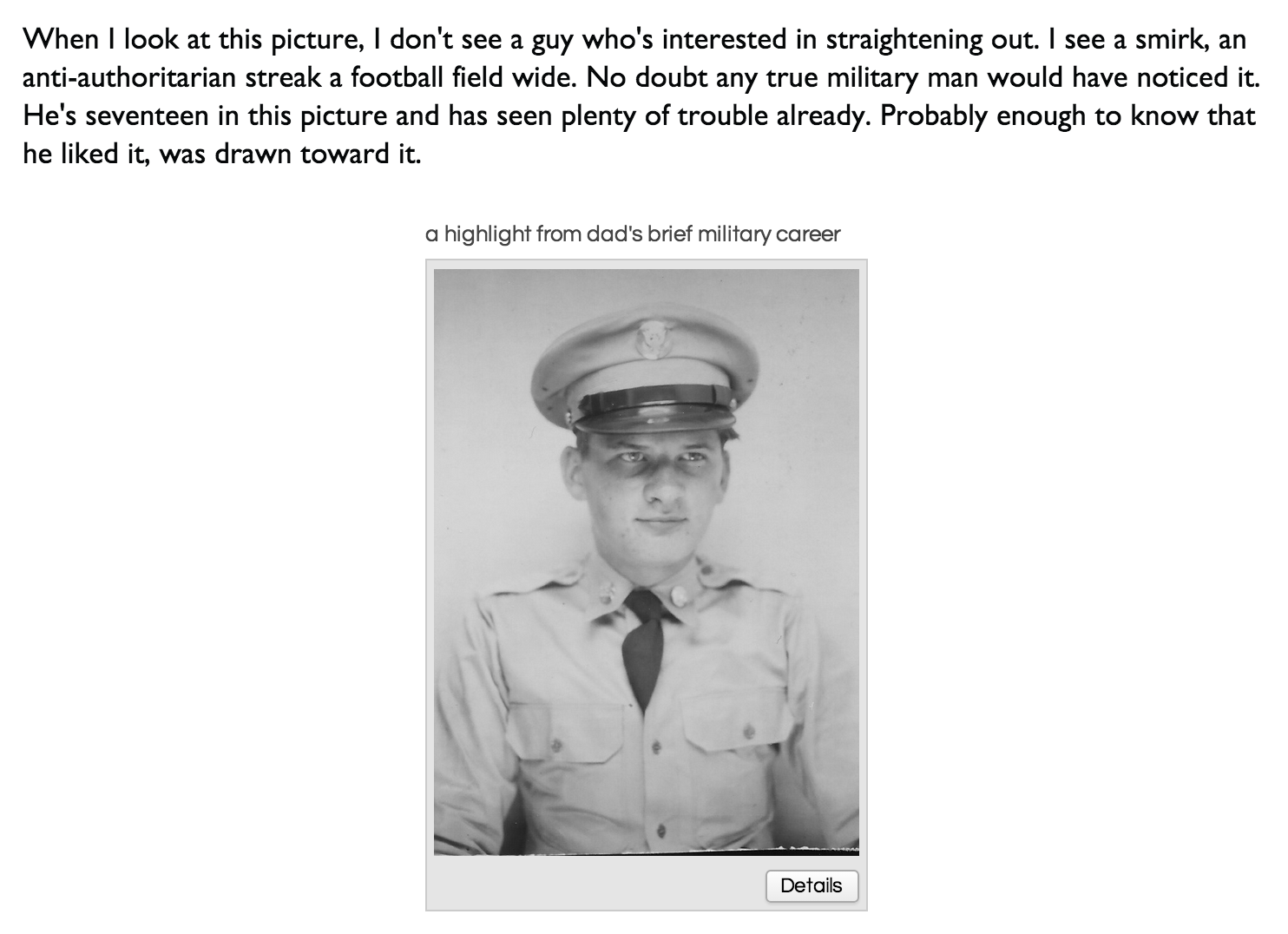 Like several of the interactive documentaries profiled at ICIDS, daddylabyrinth offers multiple curated paths through its assorted reflections. But it also tempts the reader with many diversions, many opportunities to go off and look at a document or a fuller explanation of a particular experience. Individual documents stand at the crossroads of different interpretive paths: dad’s army records can be part of an initial character sketch of Wingate’s father, or an element in a more thorough history of his army career, or part of a story about Wingate’s mother’s campaign to get those records altered. Many times a fresh path opens out of the middle of another, with the tempting “begin this path…” button offering a way in. Sometimes following links takes you through an unexpected loop, and over time certain pages repeat. Likewise, when you reach the end of a path, clicking the “end of path – continue” link lands you somewhere entirely unexpected and new (but thematically linked).