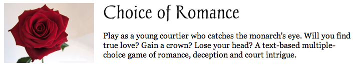 This is a challenging review for me. Obviously, I’m sorry the reviewer didn’t have a good time. It’s possible that I could or should have done something to frame the presentation of the game to make clear that it was not going to be a traditional fairy tale happy-ending romance. (The closest thing to that I’ve ever written is Pytho’s Mask, which, not coincidentally, has some pretty shallow characters and a heavily gender-bound treatment of love; even so some subversive elements snuck in before the end.) Perhaps I seemed to offer something the game was never going to deliver — and, for what it’s worth, I do think that players have the right to want specific things from their games. Indeed, if the player doesn’t want something, she’s not likely to play for long.
