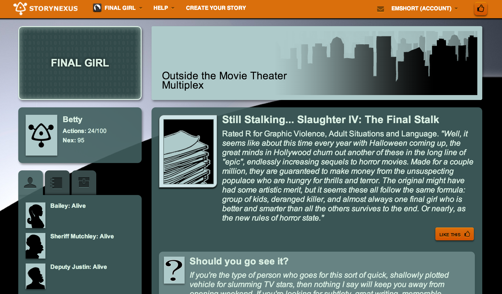 Choice of the Deathless, from the long-running Choice of Games line. This one is about a magic-using, demon-contract-making law firm. In general, games in this series do a lot with player character customization, providing lots of ways to experience similar issues and problems. Choice of the Deathless has an especially strong premise and setting. Choice of the Deathless is for pay; Choice of Games also offers some freebie experiences, though in my opinion they are a bit less good.
