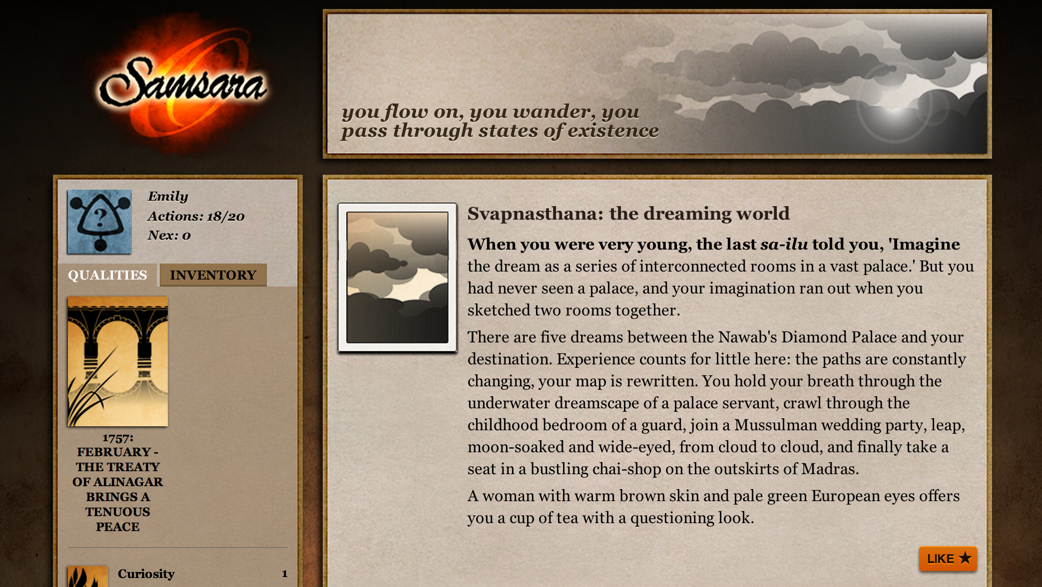Samsara is a game written for StoryNexus, and the first place winner of Failbetter’s recurring “World of the Season” competition. (The second and third place were taken by Zero Summer, which appears to be an apocalyptic western of sorts [I have yet to play it]; and Evolve, a Spore-like story game that starts you off as a one-celled creature.)