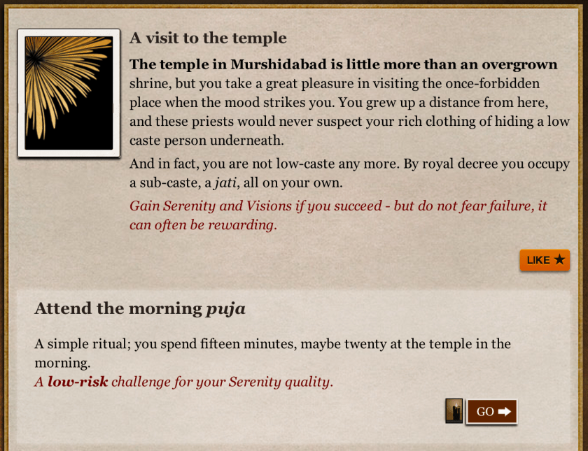 Perhaps my growing familiarity with the system is at play here, but I was also impressed by how quickly Samsara gets its story off the ground. The opening phases of StoryNexus/quality-based narrative pieces are typically, in my experience, the rockiest aspect of the whole experience, because there is so much to teach about how the system will work, and because establishing character, setting, and motive within such brief snippets of prose can be challenging. Several pieces open with a long, linear introduction that doesn’t convey what the rest of the experience is going to be like, or else offer the player a bewildering array of options too soon. By contrast, Samsara establishes its core issues exceptionally quickly, introducing the idea of dream travel as well as the conflicts between local rulers, French and British army and trading interests, and competing religions and castes, all within a few short moves.