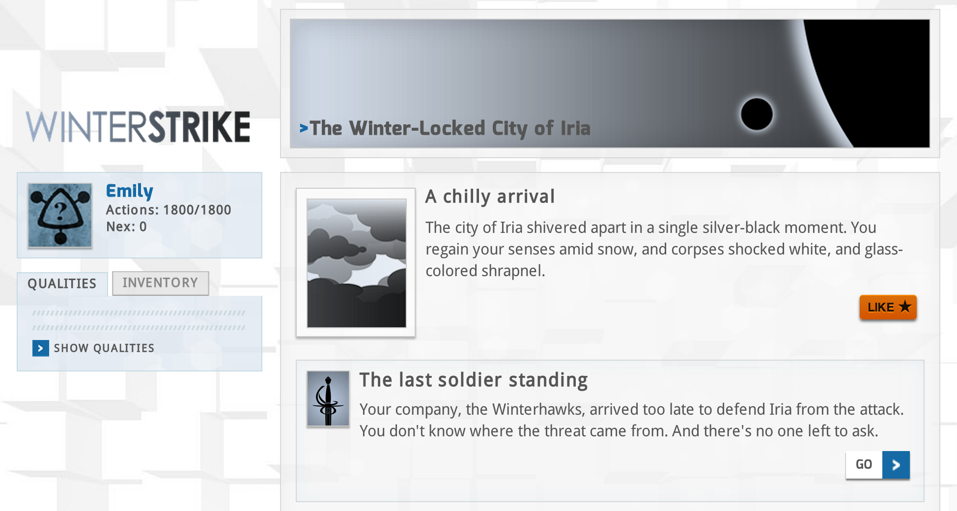 Another consequence of the mechanic is that it tends to be very much up to the player what narrative line she wants to pursue, and often playing a StoryNexus game feels like it’s more about texture than about plot. Moreover, because the stories are told so incrementally and the words themselves are the main reward for playing, each individual bit of text has to work very well on its own. The premium on well-turned sentences is higher in this medium than in almost any other kind of interactive narrative I know. Even parser IF is more forgiving.