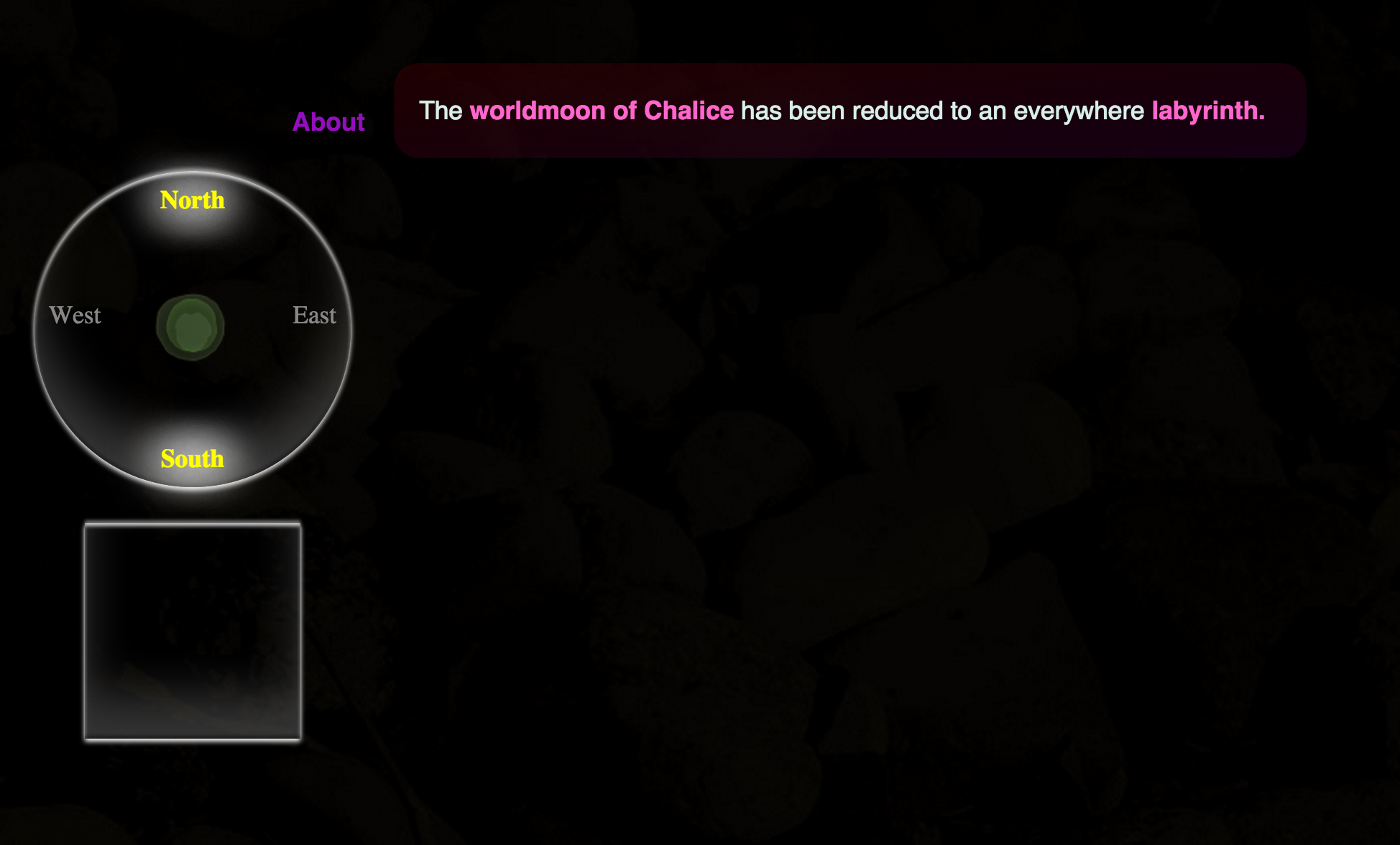 In one spot, a river scene is described as “Edenic”; elsewhere, a description of a garden is supplied by a substantial quote from Paradise Lost, though the things described in the quotation are of course not really present, and an attempt to interact with them provokes a disambiguation asking if you’re referring to “the literary flowers”. The setting is thus both childlike and prelapsarian, and yet neither the felt nor the poetry is quite real. In this respect it’s a little reminiscent of Delphina’s House, though DH allows the player to swap between realities rather than making them simultaneously present as Veeder does.