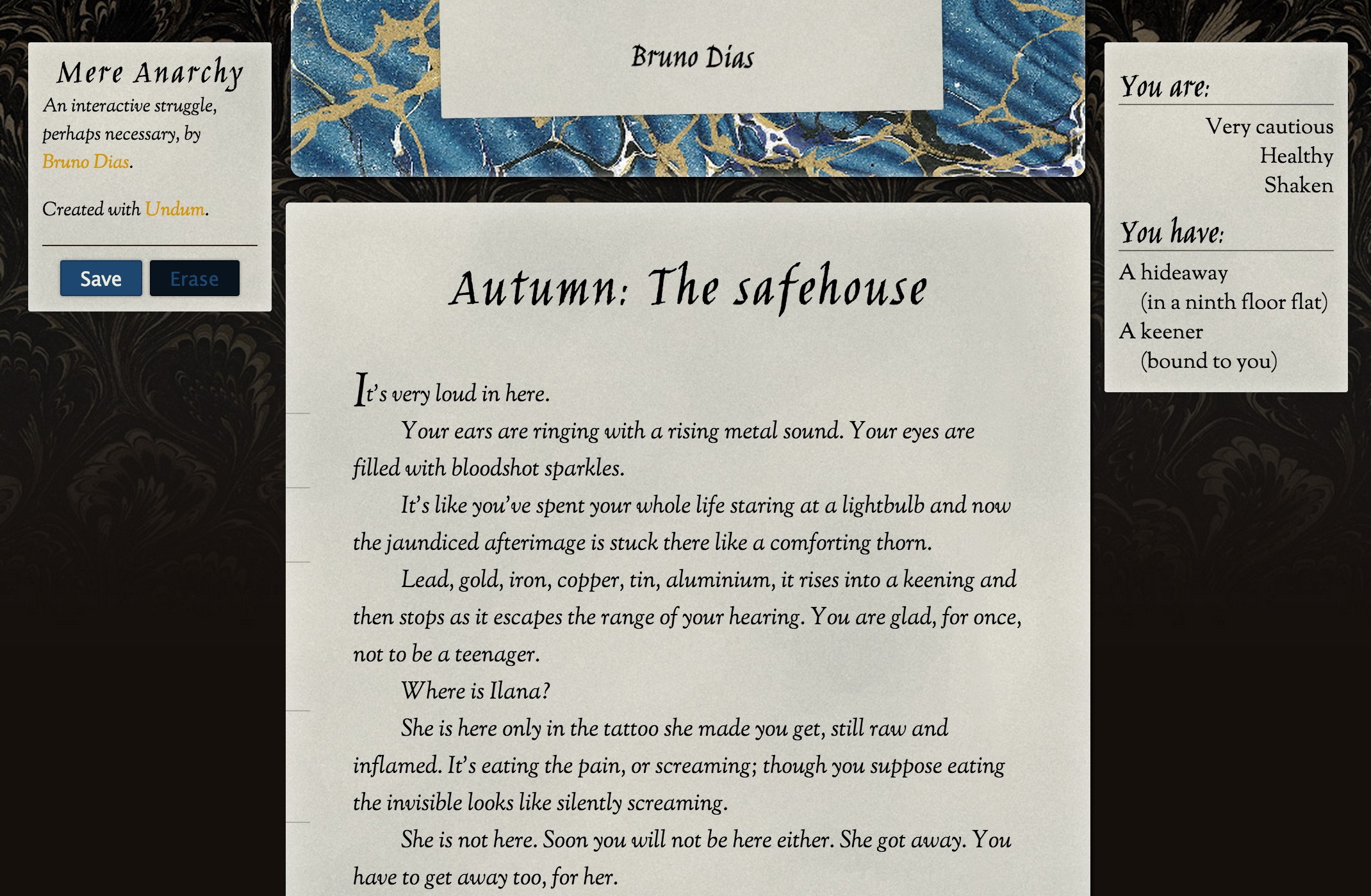 I might almost have preferred not to have that branch. I replayed the story to see what I had missed the first time around, but the structure is otherwise so tight and the emotional impact so much tied up in the process of revelation that playing for completeness the second time felt like a diminishing of the experience. Perhaps. But then, the theme of opportunity cost is also appropriate for the story. And then, also, I understood the shape of the piece better the second time around, so perhaps it was worthwhile to encourage this. I don’t know.