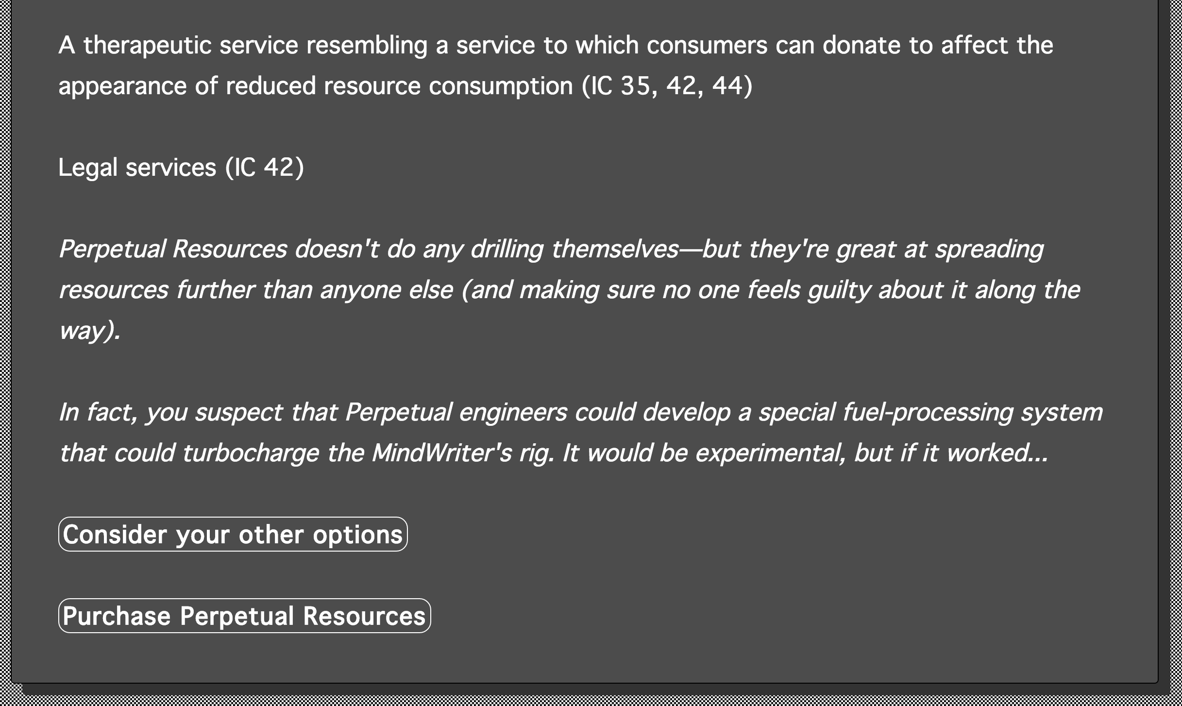 A(s)century is a cyberpunk Twine piece about a dystopian future in which the line between corporation and government has been wholly erased, and your job (at least initially) consists of writing ghastly corporatese copy for various advertising purposes. It’s dark satire — often very dark, with companies that offer tourist services to view the end of a species going extinct, and “therapeutic services” where people can donate to pretend to themselves that they’re doing something to help the world, even though their donations do nothing and mean nothing. Workers are interchangeable and disposable, the line between human and AI gradually erased. Creative workers are referred to as “crates” and are treated about as well as that naming might imply.