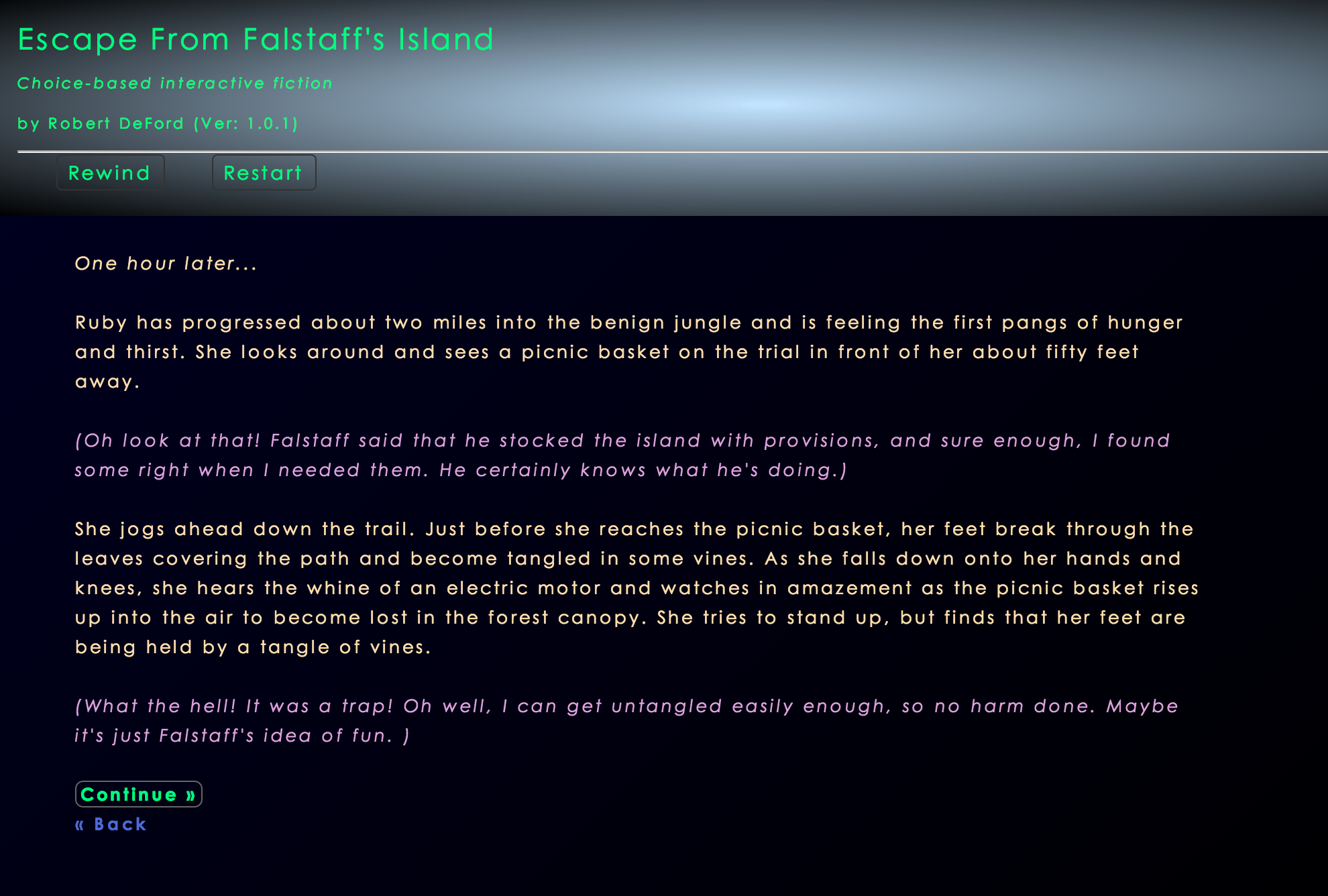 Which is why Mirrorwife is such a surprising evolution of the song. It takes the simple barebones premise and turns it into something strange and fantastical, which takes most of the game even to understand. (Sure, it’s a short game. But still.) It takes a song about separation and makes a game about homecoming, of sorts. And it does this in a way that is intentionally spare and dry. Though it’s in Twine, and though the story concerns people, most of Mirrorwife is told through settings and object descriptions, terse and evocative and cold.
