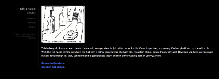 Rat Chaos is a very short Twine piece. It plays with agency not in the usual ways (discovering you have none, playing with how the protagonist refuses to claim agency, or revealing that the only meaningful agency the player can have is to quit the game). Instead, Rat Chaos explores the idea of surface agency as a distraction; the notion that solving the more obvious problems might be a way to shut someone up, to avoid listening to the deeper things they have to say. The first couple of screens may seem bewildering, but it’s a quick play whose significance reveals itself after not too long.