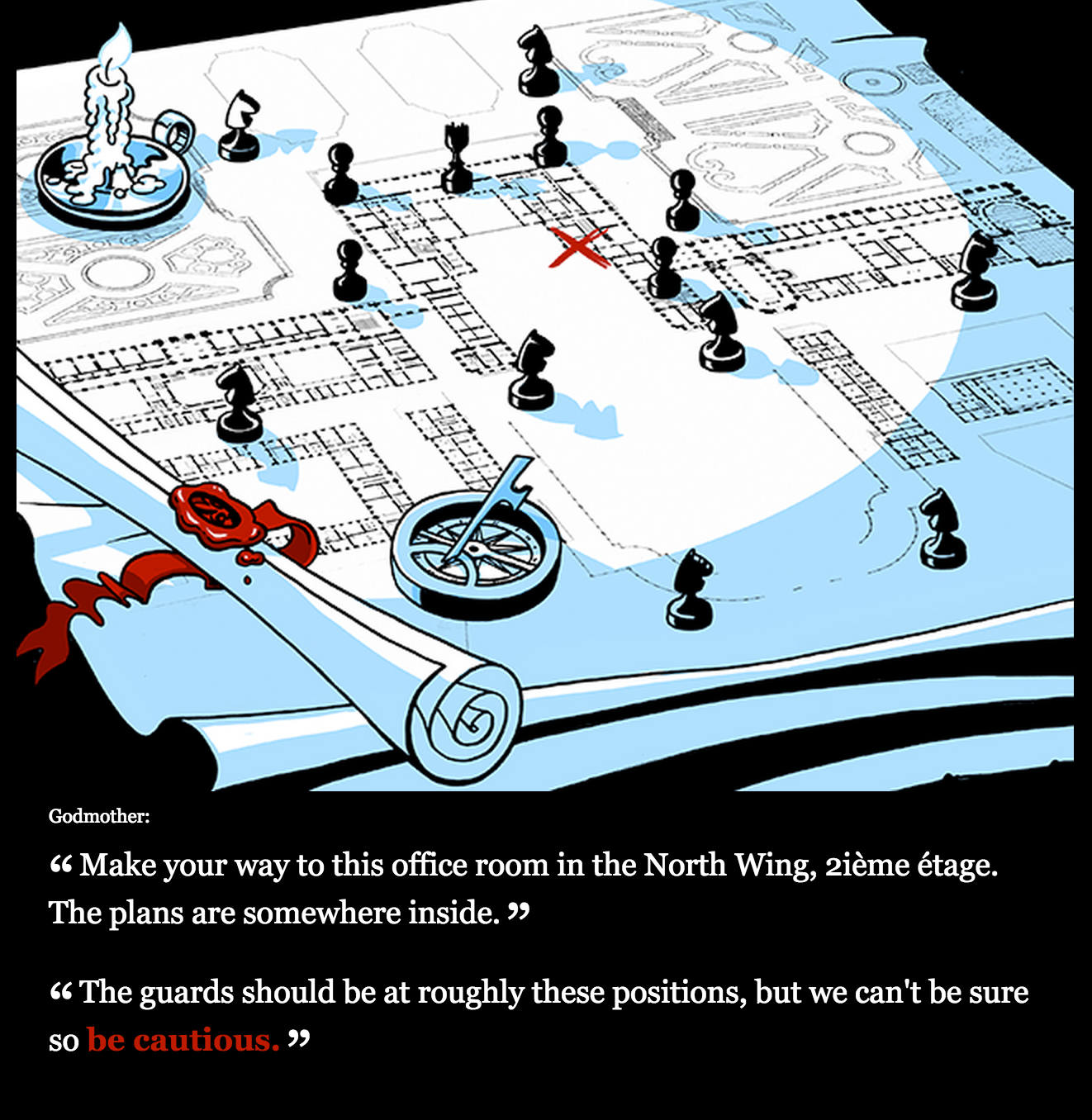 Besides having a map, Secret Agent Cinder uses illustration as a primary channel for storytelling: the pictures aren’t just a gloss on the text, but give key information about, say, the locations of guards. If you don’t pay attention to them, you’re likely to get caught. Many of the jokes are embedded in the imagery as well; it plays more like an interactive web comic than most things I can think of.