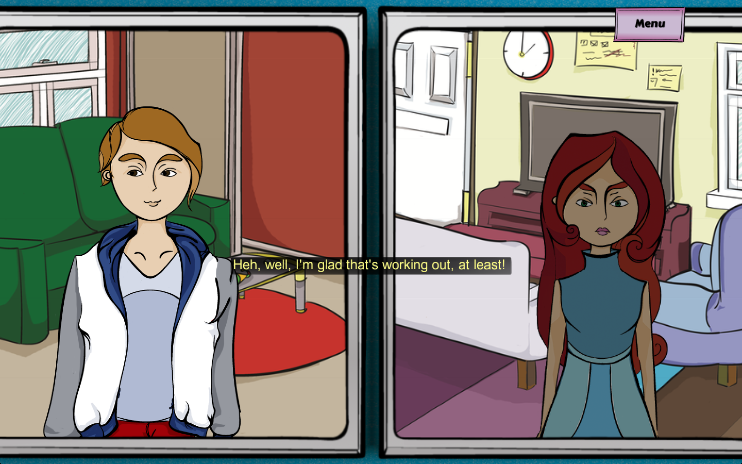 But mostly, the substance of the game is conversation, very lightly animated. The things you’re allowed to say depend partly on the mood you’re in, with conversation options tinted different colors if they happen to be unlocked by your current frame of mind:
