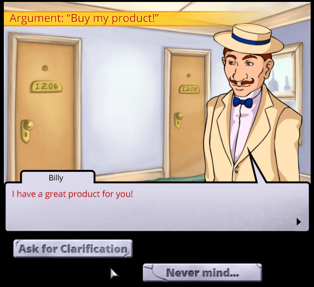 Emily says (to DavidW), “you get different reactions depending on the words you use to refer to certain entities in the game, as I understand it”